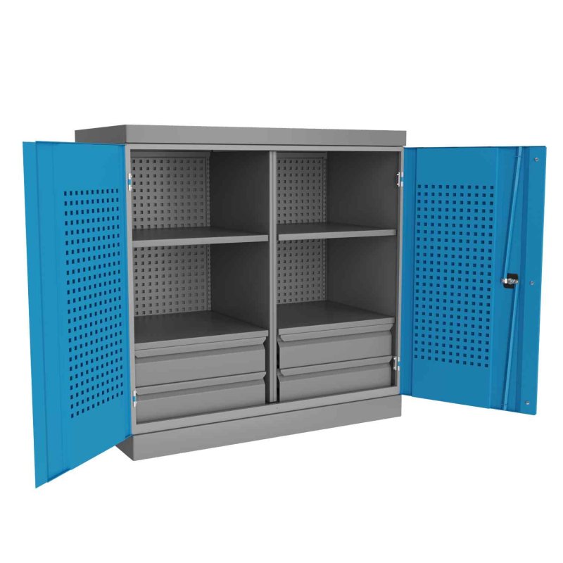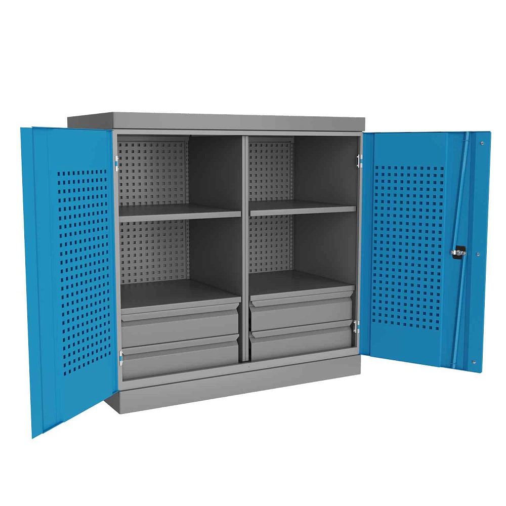 Металлический инструментальный шкаф Technic (антресоль) предназначен для хранения оснастки, приспособлений и инструмента на рабочих местах в мастерских, цехах и других производственных зонах.