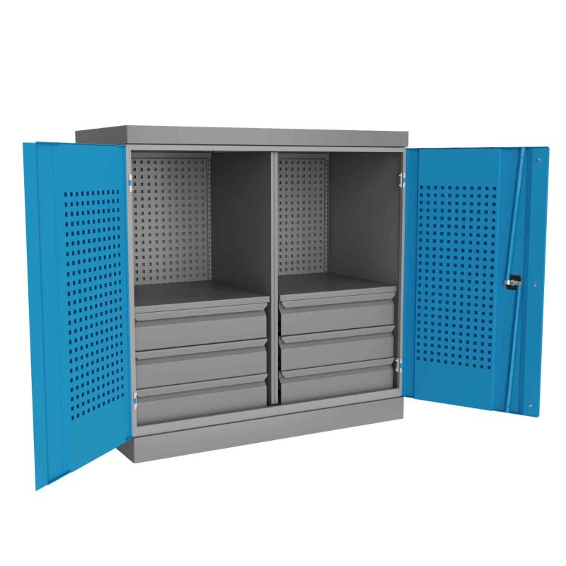 Металлический инструментальный шкаф Technic (антресоль) предназначен для хранения оснастки, приспособлений и инструмента на рабочих местах в мастерских, цехах и других производственных зонах. Шкаф изготовлен из листовой стали и обеспечивает надежное запирание дверей ригельной системой.
