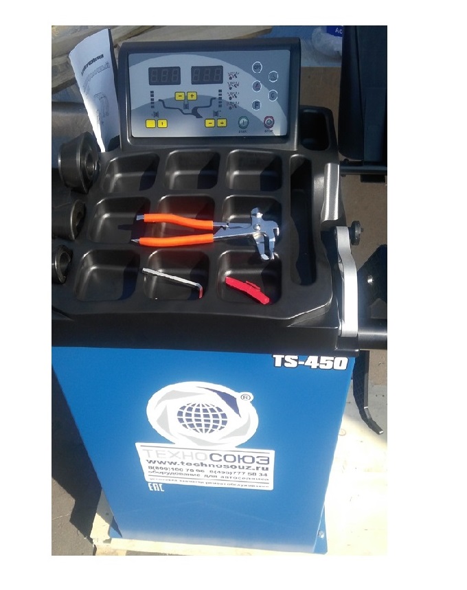 TS-450 Балансировочный станок для колес легковых автомобилей, мотоциклов и легких грузовиков. Автозапуск опусканием кожуха. Для колес легковых автомобилей, мотоциклов, «Газелей», «Спринтеров» и т.п. Ø до 760мм. Размеры диска: ширина 3–9” (76-228 мм) , диаметр диска 10–24” (256÷610 мм). Вал-36 мм. Максимальный вес колеса с диском – 65кг. C кожухом. Точность ±1гр. Напряжение 220В. Режимы DINAMIC, STATIC, ALU1, ALU2, ALU3,  ALUS, ST. Автокалибровка. Режим OPT.