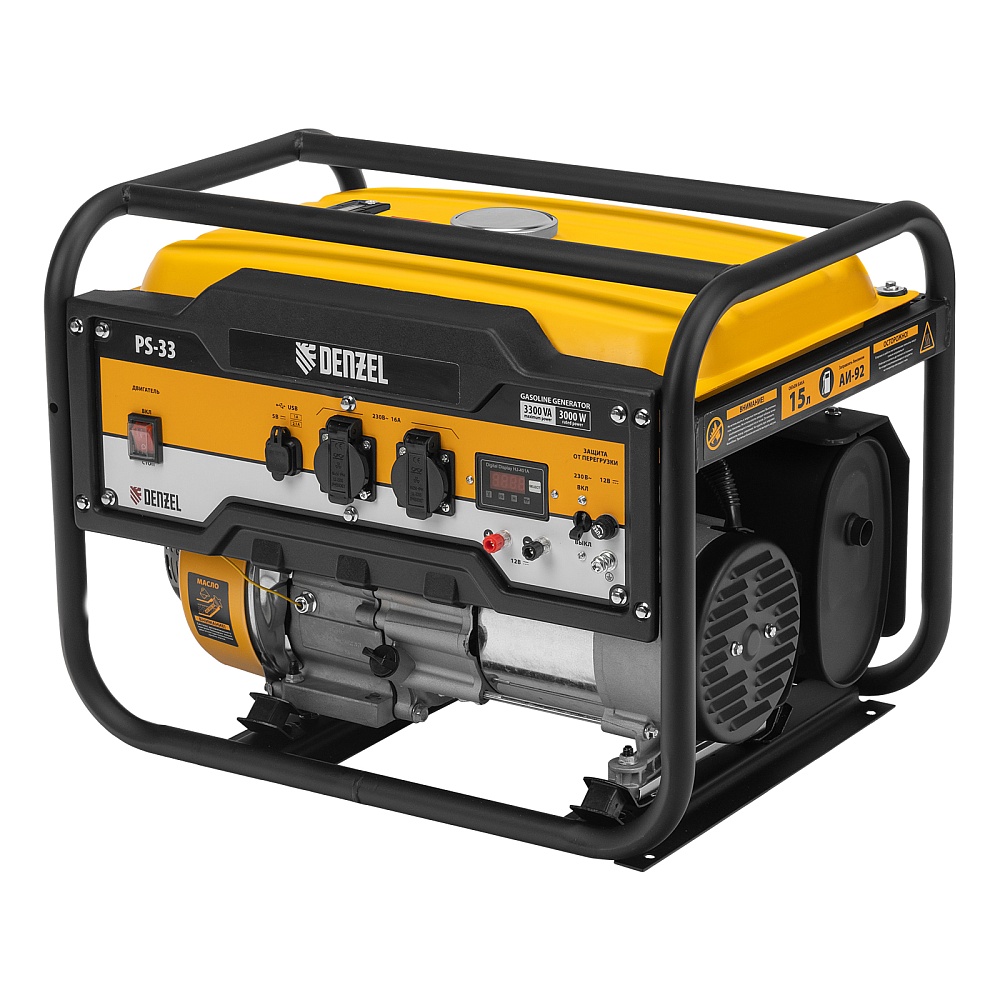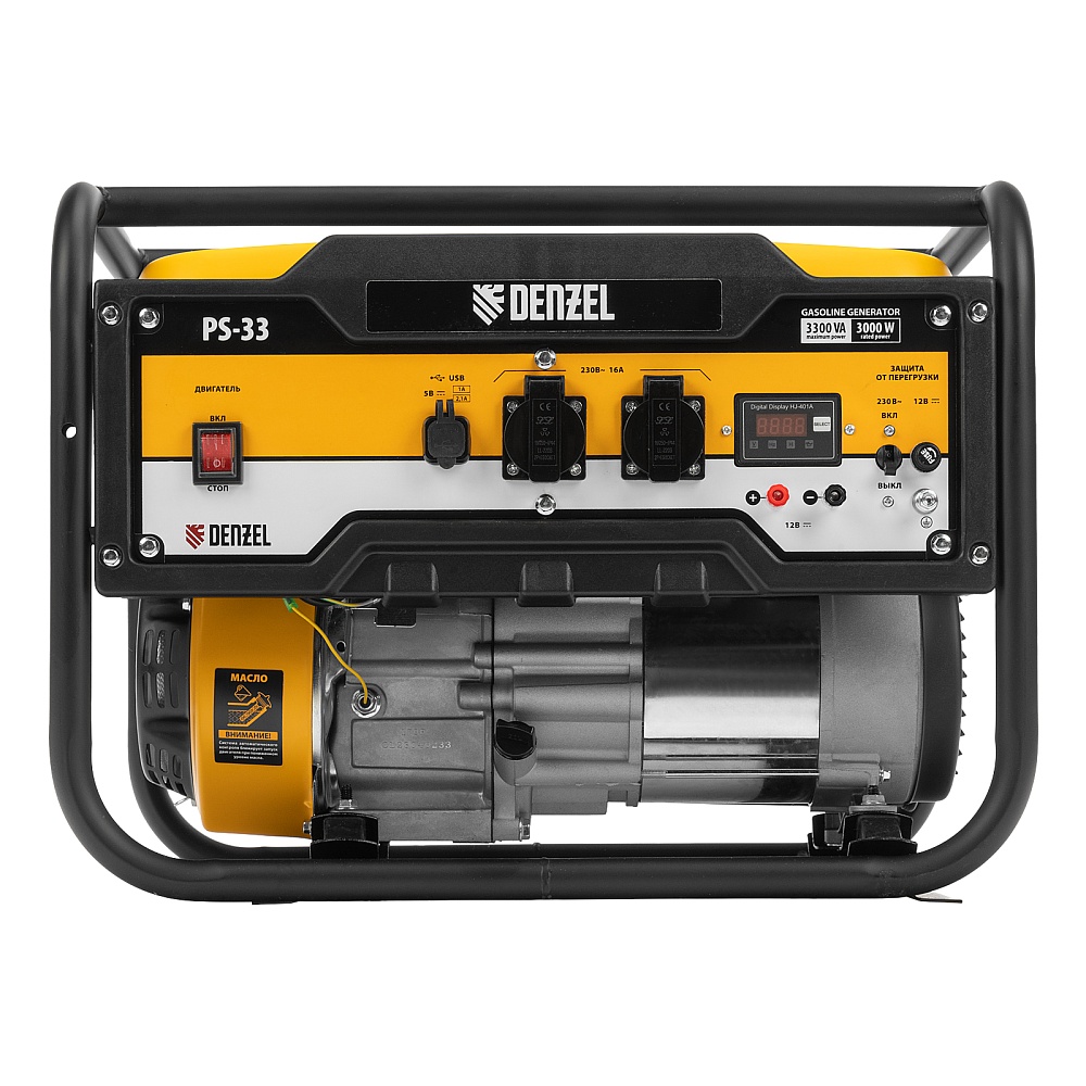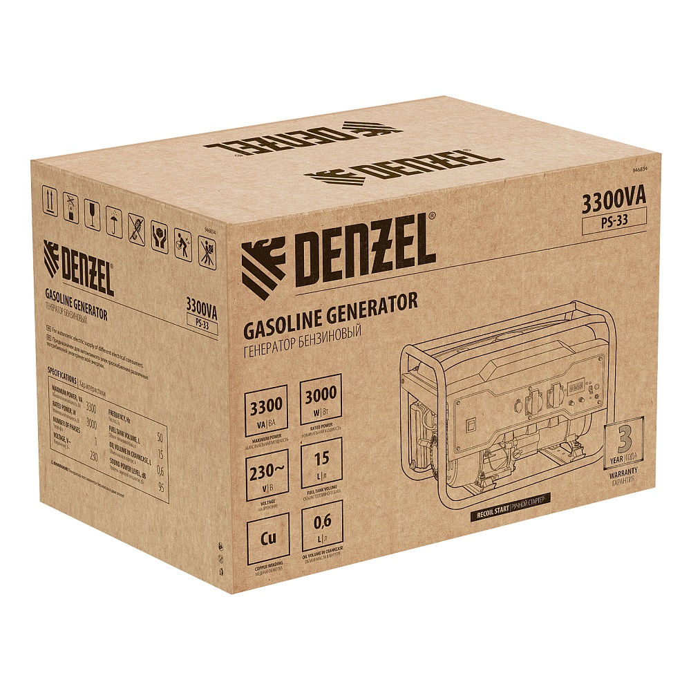 <p>Генератор бензиновый Denzel PS 33 946834 максимальной мощностью 3,3 кВт при параметрах сети 230 В, оснащен ручным стартером и увеличенным бензобаком на 15 л. Предназначен для автономного электроснабжения однофазным током маломощного оборудования. Это экономичная и простая в использовании модель, оптимально подходящая для дачного участка, домашней мастерской, кемпинга и рыбалки, а также строительной площадки. </p><p>Генератор станет отличным помощником в условиях отсутствия электричества. Например, можно одновременно подключить 5 ламп дневного освещения, ноутбук, холодильник, телевизор и электрочайник.</p><h2>Преимущества</h2><ul><li>Комфортная эксплуатация — надежный четырехтактный двигатель с верхним расположением клапанов (OHV) экономично расходует топливо и имеет небольшой уровень шума 85 дБ.</li><li>Безопасность — защита от работы при низком уровне масла, от перегрузки и короткого замыкания значительно продлевает срок службы генератора.</li><li>Долгое функционирование — благодаря увеличенному бензобаку генератор способен работать более 12 часов без дозаправки.</li><li>Простая навигация — все элементы управления вынесены на переднюю панель и интуитивно понятны.</li><li>Удобный контроль параметров работы — производитель предусмотрел вольтметр и индикатор уровня топлива.</li><li>Возможность подключения чувствительной техники — блок AVR обеспечивает работу без скачков напряжения.</li><li>Надежность — увеличенный диаметр провода обмотки статора, медная обмотка альтернатора и металлический распределительный вал улучшают качество работы.</li><li>Легкое перемещение — генератор отличается небольшими габаритами 60×44×46 см.</li><li>Гарантия 3 года — высокое качество генератора подтверждено производителем.</li></ul>