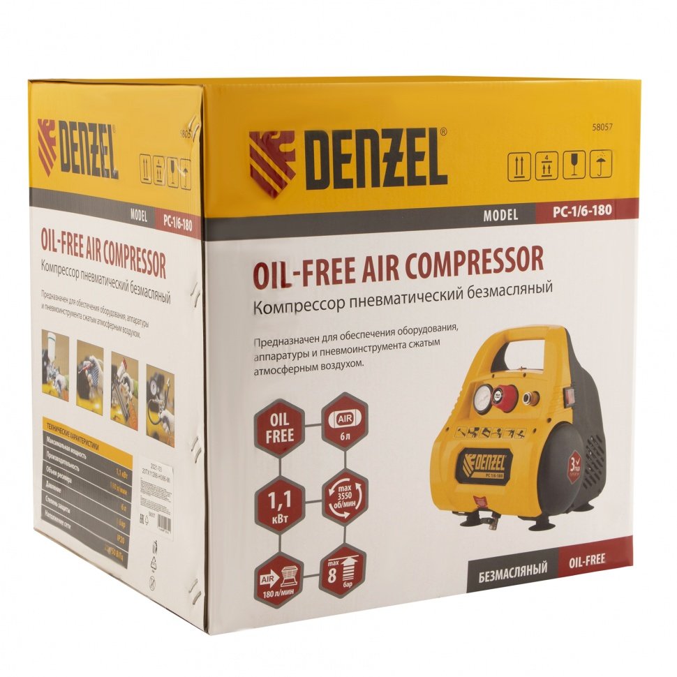 Компрессор воздушный безмасляный РС 1/6-180, 1,1 кВт, 180 л/мин, 6 л// Denzel купить в Нижнем Новгороде цена ✅ - Все для СТО