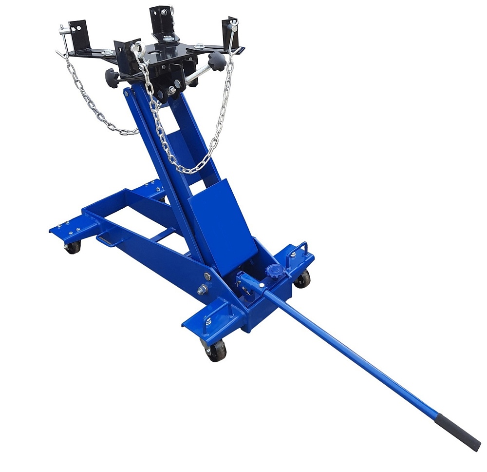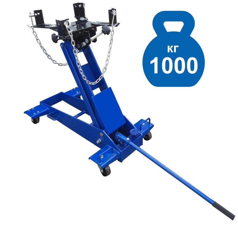 Трансмиссионная гидравлическая стойка (домкрат трансмиссионный) является мобильным подъёмным устройством. С ее помощью можно поднять и переместить снятый узел. При подъеме на требуемую высоту удобно монтировать снятый агрегат. Цвет темно-синий.