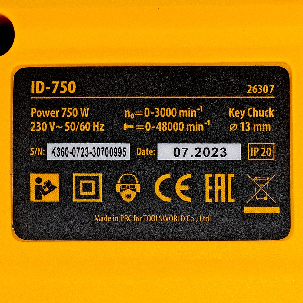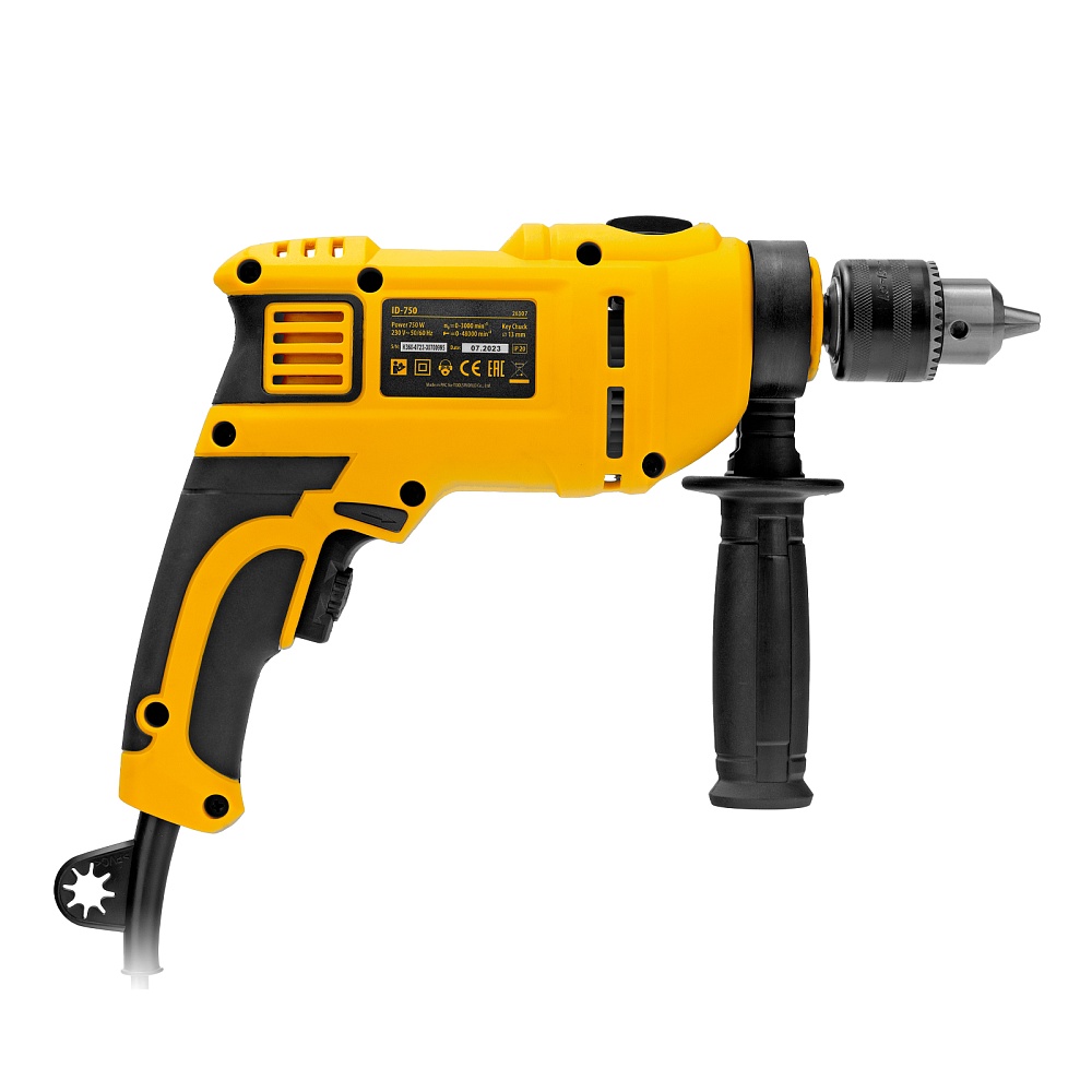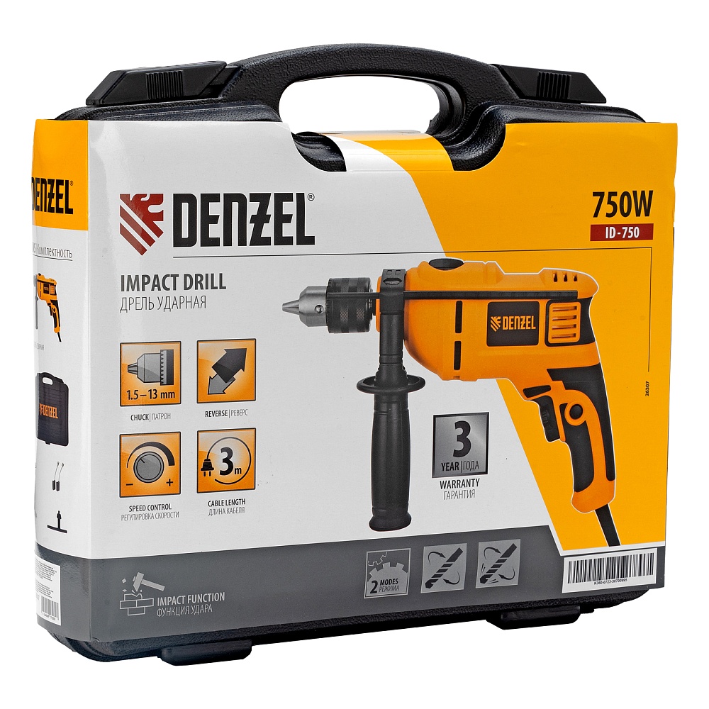<p>Ударная дрель Denzel ID-750 26307 мощностью 750 Вт поддерживает скорость вращения оснастки 0-3000 об/мин и частоту ударов 48000 уд/мин. Используется для ручного или ударного сверления металла, древесины, легкого бетона, кирпича, плитки или пластика. Сверлит отверстия диаметром до 25 мм в древесине, до 13 мм в бетоне и до 13 мм в металле. Эффективное сверление твердых материалов обеспечивает массивный промщит ударного механизма. Дрель работает со сверлами с диаметром хвостовика 1,5-13 мм, что позволяет эффективно решать различные задачи.</p><h2>Преимущества</h2><ul><li>Выбор оптимального режима — предусмотрена плавная регулировка частоты вращения патрона и возможность отключения ударного режима для работы с материалами разной плотности.</li><li>Высокий ресурс — медная обмотка двигателя, усовершенствованная конструкция щеточного узла и прочный пластиковый корпус выдерживают интенсивное использование. </li><li>Безопасность пользователя — токопроводящие элементы имеют двойную изоляцию</li><li>Реверс — можно изменять направление вращения патрона для использования левосторонних сверл или шлифовальной оснастки.</li><li>Удобное использование — клавиша фиксации кнопки включения позволяет избежать самопроизвольного переключения частоты вращения.</li><li>Надежная фиксация оснастки — трехкулачковый самоцентрирующийся патрон затягивается с помощью ключа.</li><li>Сверление отверстий заданной глубины — предусмотрена возможность установки специального ограничителя.</li><li>Держатель для ключа — аксессуар не потеряется во время работы и хранения.</li><li>Защита от перегрева — вентиляционные отверстия на корпусе обеспечивают эффективный отвод тепла.</li><li>Свободное перемещение по рабочей зоне — длина кабеля питания составляет 3 м.</li><li>Комфортная работа — основная и боковая рукоятки не выскальзывают из рук, дрель весит 1,95 кг, что позволяет долго работать без ощущения усталости.</li><li>Удобное хранение и транспортировка — дрель поставляется в прочном кейсе.</li><li>Гарантия 3 года — надежность инструмента подтверждена производителем.</li></ul>