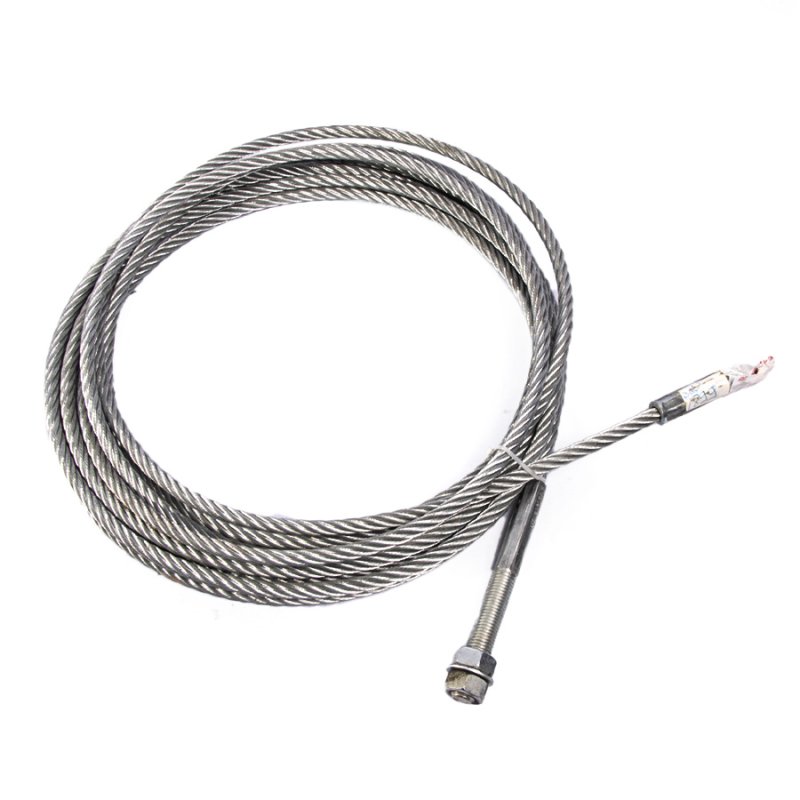 Трос подъема и синхронизации платформ. Изготовлен из прочного стального каната с металлическим сердечником, долговечен, выдерживает тяжелые нагрузки. В конструкции подъемника используется четыре троса разной длины; Длина троса: 10700мм. Диаметр троса: 9,5мм. Диаметр шпилек: 20мм. (размер ключа 29мм) Длина шпильки: 100мм.