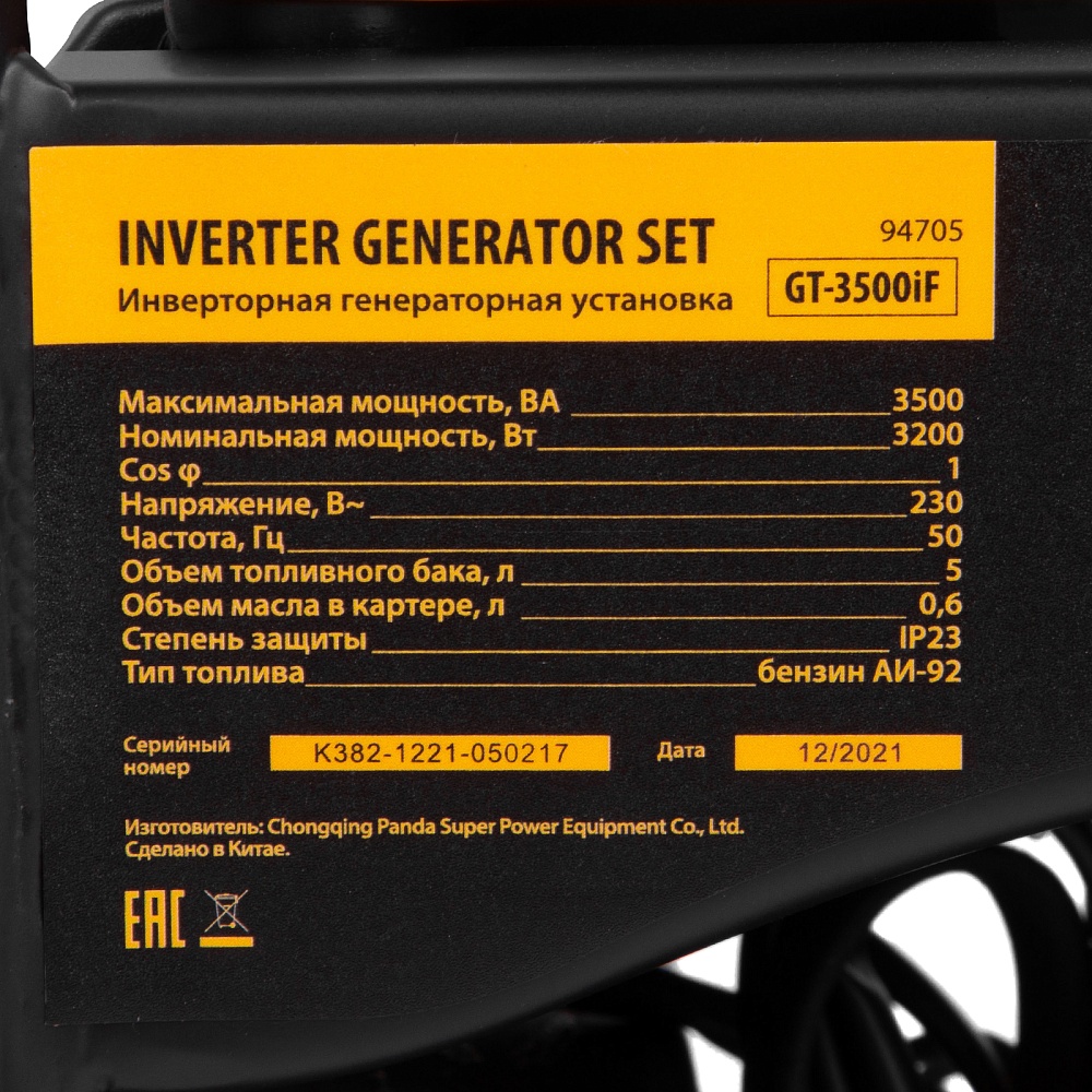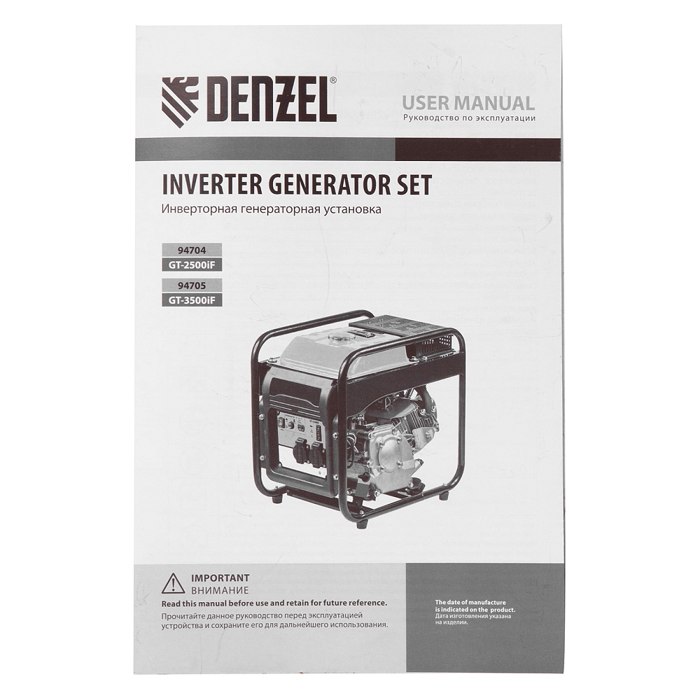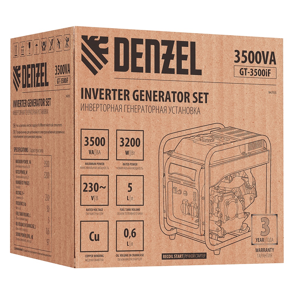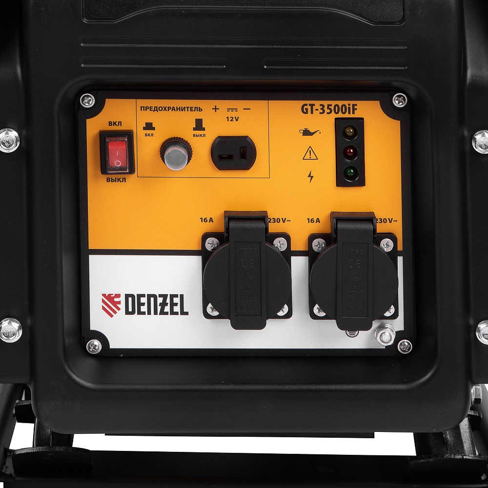 <p>Инверторный генератор Denzel GT-3500iF 94705 мощностью 3,5 кВт, в открытом корпусе, с ручным стартом, — легкий и экономичный, но при этом достаточно мощный, с ним легко справится даже неопытный пользователь. Идеально подходит для использования на даче, в гараже, в мастерской и на природе. Четырехтактный двигатель Denzel Long Life мощностью 7 л.с. и объемом 212 куб. см работает стабильно и имеет относительно невысокий уровень шума (97 дБ) и вибраций. Прочная рама защищает рабочие элементы от повреждений в процессе работы и транспортировки.</p><h2>Преимущества</h2><ul><li>Высокое качество тока — генератор оптимален для подключения наиболее чувствительных к перепадам напряжения приборов: компьютерной техники, газовых котлов с электронным управлением, охранных и пожарных систем.</li><li>Защита от поломки — при низком уровне масла, перегрузке или коротком замыкании двигатель автоматически отключается.</li><li>Долговечность — полностью стальные коленвал и распредвал, закаленные токами высокой частоты, чугунная гильза цилиндра и альтернатор с медной обмоткой увеличивает срок службы аппарата.</li><li>Визуальный контроль — индикаторы на передней панели информируют о работе генератора, недостаточном уровне топлива и о перегрузке.</li><li>Долгая работа без дозаправки — генератор способен работать почти 4,5 часов на 5 л топлива.</li><li>Оптимизированная антивибрационная система — преждевременный износ внутренних узлов исключен.</li><li>2 розетки 230 В на передней панели — можно одновременно подключать пару потребителей без использования удлинителя.</li><li>Влагозащита электрокомпонентов — крышки на розетках блокируют попадание частиц воды и пыли на контакты.</li><li>Простое обслуживание — открытый корпус обеспечивает легкий доступ к фильтру, картеру и свече зажигания.</li><li>Гарантия 3 года — высокое качество генератора подтверждено производителем.</li></ul>
