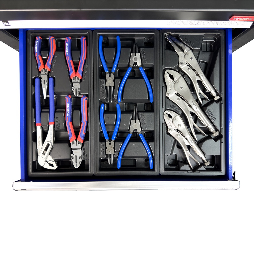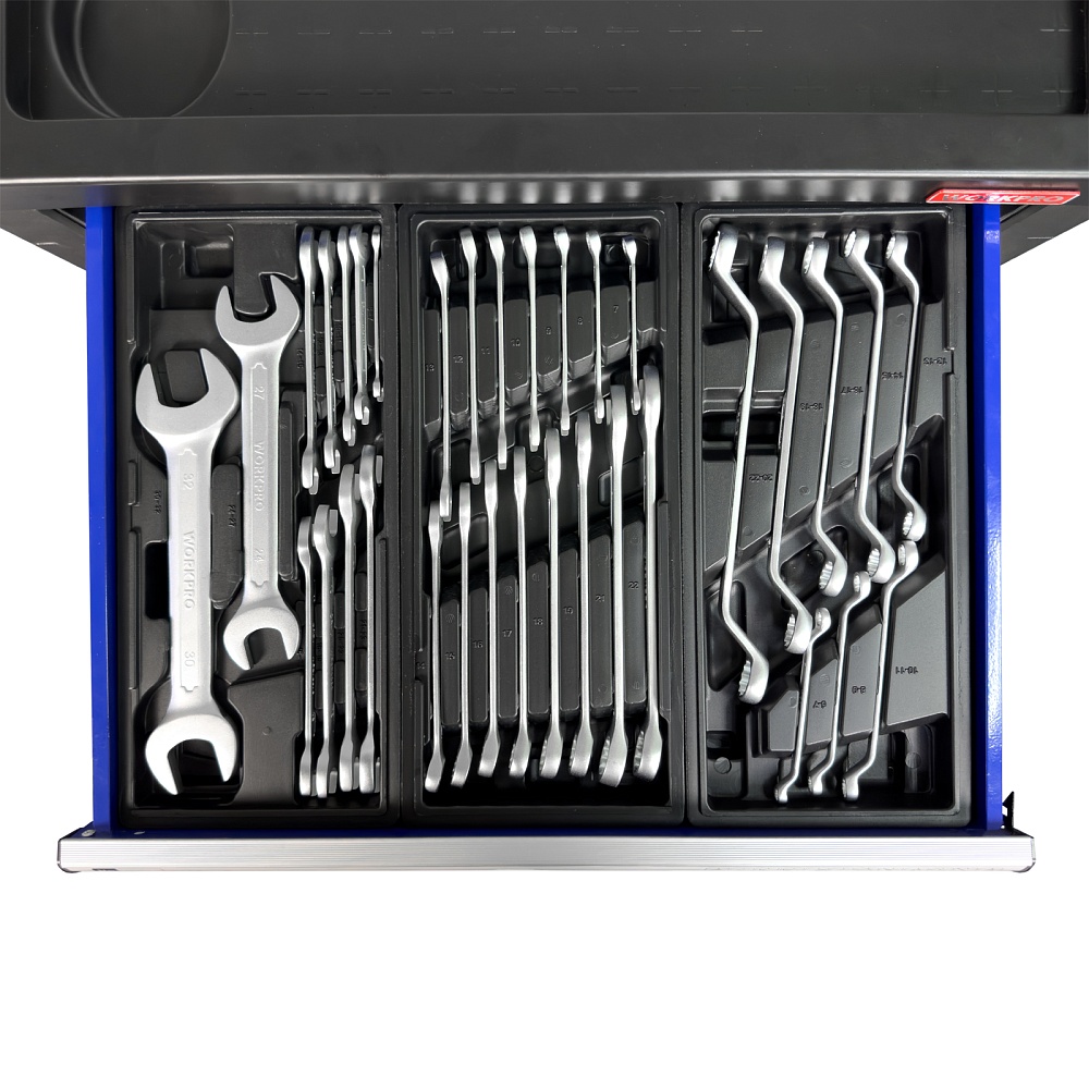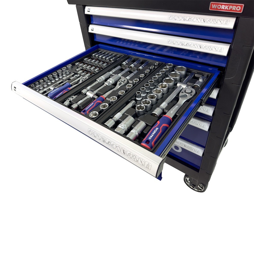 Тележка WORKPRO — это 7 выдвижных ящиков на подшипниках различного объема, где Вы можете разместить свой инструмент для работы, которым часто пользуетесь. Каждый ящик оборудован системой блокировки. Долговечные стальные направляющие прочно удерживают полку в выдвинутом положении.