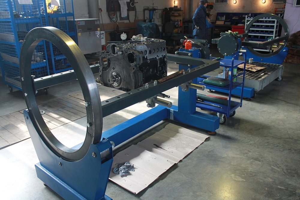 Конструкция стенда позволяет вывешивать ремонтируемый агрегат в удобной позиции для его последующей разборки и сборки. Поворот рамы на 360° позволяет проводить разборку и сборку любых труднодоступных узлов двигателей.