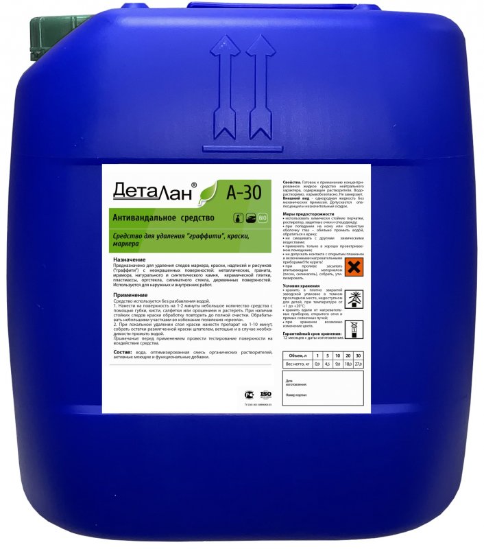 Деталан А-30 - это средство предназначено для удаления следов маркера, краски, надписей и рисунков ("граффити") с неокрашенных поверхностей - металла, гранита, мрамора, натурального и синтетического камня, керамической плитки, пластмассы, оргстекла, силикатного стекла, деревянных поверхностей. Используется для наружных и внутренних работ.