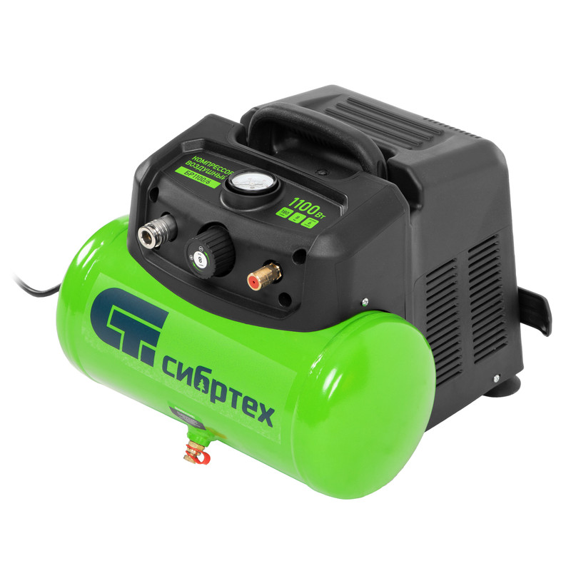 Воздушный безмасляный компрессор Сибртех BL 1100/6 58059 мощностью 1100 Вт, с ресивером емкостью 6 литров, служит для подачи сжатого воздуха под давлением до 8 бар со скоростью 180 л/мин. К нему можно подключить краскораспылитель, продувочный пистолет, заклепочник, пистолет для накачки шин и другой пневмоинструмент. Отсутствие масла делает компрессор оптимальным для выполнения покрасочных работ и продувки электронных компонентов. Устройство предназначено для бытового использования.Одна из основных особенностей данной модели — компактность и удобство в перевозке. Компрессор отличается небольшим весом и дополнен эргономичной транспортировочной ручкой.ПреимуществаАвтономность — прессостат обеспечивает автоматический запуск двигателя и его остановку в зависимости от уровня давления в ресивере.Простая подготовка к работе — быстроразъемный выходной коннектор «Рапид» (евро) позволяет легко подключить пневмоинструмент.Удобное управление — при помощи поворотного регулятора на передней панели можно установить нужное значение давления.Контроль давления в ресивере — в верхней части корпуса расположен манометр, для считывания показателей не нужно наклоняться.Предохранительный клапан — возможность сброса избыточного давления позволяет избежать аварийных ситуаций.Продуманная конструкция — виброгасящие опоры обеспечивают устойчивость компрессора во время работы.