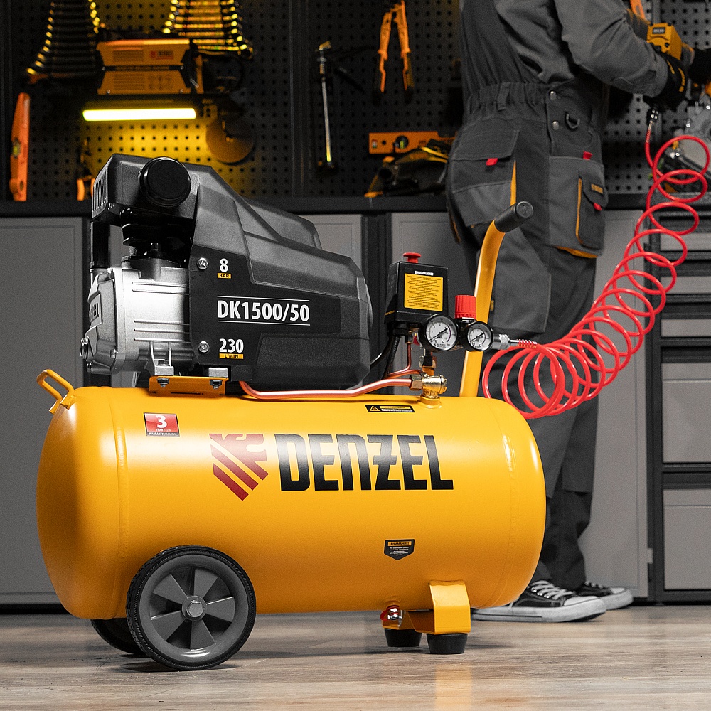 <p>Воздушный компрессор Denzel Х-PRO DK1500/50 58064 мощностью 1,5 кВт, производительностью 230 л/мин, имеет ресивер объемом 50 л и подходит для бытового использования. Обеспечивает подачу воздуха к различным пневматическим инструментам: шуруповерту, краскопульту и др. Будет незаменим в гараже, когда надо подкачать колеса автомобиля или подкрасить его отдельные детали, а также на даче или в частной мастерской. Несмотря на простоту конструкции, компрессор имеет хорошую производительность и возможность подключения сразу нескольких инструментов. </p><h2>Преимущества</h2><ul><li>Автозапуск — в ресивере поддерживается необходимый уровень давления для корректной работы пневмоинструментов.</li><li>Контроль рабочих параметров — два манометра отображают давление в ресивере и выходной магистрали.</li><li>Защита от перегрева — в случае превышения допустимой температуры двигатель отключается.</li><li>Защита по току — при перегрузке двигатель останавливается для предотвращения поломки.</li><li>Безопасность — предохранительный клапан сбрасывает избыточное давление в случае необходимости.</li><li>Простая подготовка к работе — быстросъемные коннекторы рапид (Евро) значительно облегчают процесс подключения пневмоинструмента к компрессору.</li><li>Устойчивость к разрушению — стенки ресивера имеют увеличенную толщину (2,5 мм), сварные швы отличаются высокой прочностью.</li><li>Ремонтопригодность — раздельное крепление цилиндра к картеру и головки к цилиндру облегчает замену вышедших из строя элементов.</li><li>Надежная система фильтрации — воздушный фильтр с металлическим корпусом и качественным картриджем из гофробумаги рассчитан на долгий срок службы.</li><li>Быстрое удаление влаги — сливная пробка со специальными ушками легко откручивается и закручивается, что упрощает слив конденсата после окончания работы.</li><li>Мобильность — транспортировочные колеса позволяют легко перемещать компрессор по рабочей площадке.</li><li>Виброзащита — резиновая опора гасит вибрации, поэтому работа компрессора не вызывает дискомфорт.</li><li>Гарантия 3 года — надежность компрессора подтверждена производителем.</li></ul>