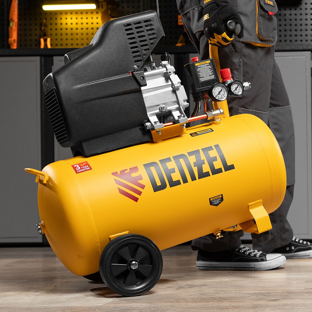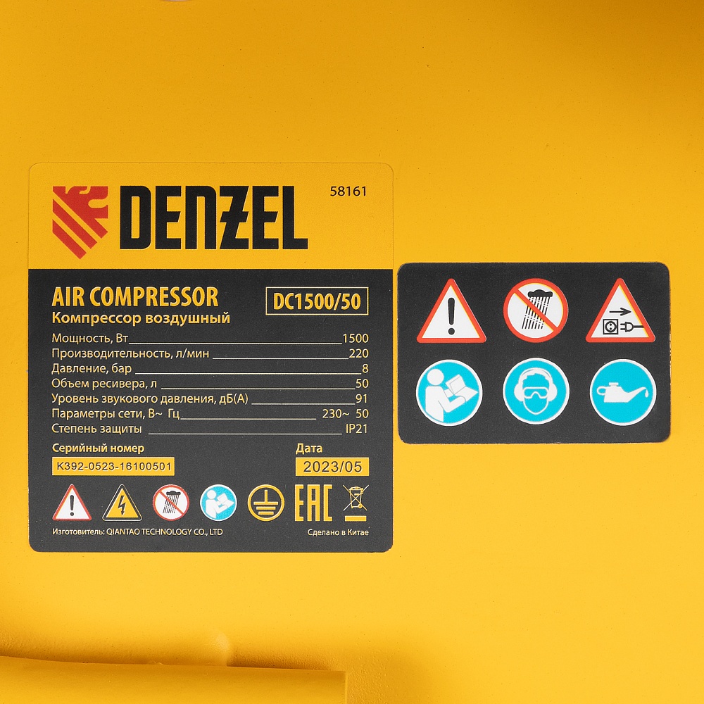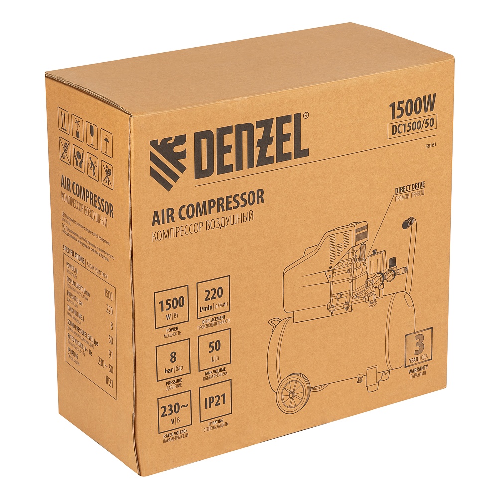 <p>Воздушный компрессор с прямым приводом Denzel DC1500/50 58161 мощностью 1,5 кВт и производительностью 220 л/мин, с объемом ресивера 50 л, используется для подачи сжатого воздуха к пневмоинструменту, например, пневмогайковерту, пневмодрели, пневмостеплеру, пневмозубилу. Благодаря использованию смазочного масла, которое снижает износ деталей, компрессор выдерживает длительную работу и подходит для профессионального применения в автомастерской, гараже или на строительной площадке. </p><h2>Преимущества</h2><ul><li>Надежность и долговечность — чугунные цилиндр и коленчатый вал, а также ресивер из стальных листов толщиной 2,3 мм с прочными сварными швами увеличивают срок службы компрессора.</li><li>Защита по току — двигатель отключается при перегрузке, что предотвращает его преждевременный выход из строя.</li><li>Термозащита — встроенная система безопасности останавливает двигатель при перегреве.</li><li>Высокое качество изготовления — прилегающие поверхности картера прошли дополнительную механическую обработку и шлифовку, поэтому протечка масла исключена.</li><li>Эффективное охлаждение — оребренные трубки воздуховода улучшают теплоотвод.</li><li>Фильтрация без потери производительности — бумажный фильтрующий элемент обладает высокой пропускной способностью, а благодаря резиновому уплотнителю в ресивер поступает полностью очищенный воздух. </li><li>Быстрое подключение пневмоинструмента — компрессор оснащен быстроразъемным коннектором Euro (Rapid). </li><li>Два манометра — легко контролировать давление в пневмолинии и в ресивере. </li><li>Удобный слив конденсата — сливная пробка с подпальцевыми упорами легко откручивается без применения инструментов.</li><li>Мобильность — ручка и колеса облегчают перемещение компрессора по рабочей площадке.</li><li>Подтвержденное качество — гарантия на заводской брак действует 3 года.</li></ul>