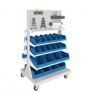 Комбинированная мобильная стойка с перфорированными панелями для инструментов и пластиковыми контейнерами для метизов, креплений и ЗИП. В комплектацию входят 2 перфорированные панели, позволяющие удобно разместить весь необходимый в работе инструмент при помощи специальных держателей: крючков, кронштейнов, специальных полок и лотков для инструмента, приспособлений для отверток, гаечных ключей, бумажных полотенец и другой оснастки. Распределенная нагрузка на перфорированную панель до 25 кг. Большие пластиковые контейнеры размещаются на 4 ярусах мобильной стойки. На нижнем ярусе кассетницы размещены 4 контейнера размером 150х225х500мм На 2 ярусе размещаются 4 контейнера размероми 150х225х500мм. Контейнеры устанавливаются на полки SP 403 с допустимой нагрузкой до 50 кг. На 3 и 4 ярусах размещаются 24 контейнера размером 130х150х250мм - по 6 контейнеров на одной стороне каждого яруса. Контейнеры устанавливаются на полки SP 402 с допустимой нагрузкой до 40 кг. Всего в комплектации Mobiler SPK3 - 36 вместительных контейнеров. Дополнительно мобильная стойка комплектуется двумя навесными полками SP401 с допустимой нагрузкой до 30 кг для размещения и хранения вещей без пластиковых контейнеров. Общая допустимая нагрузка на мобильную стойку до 450кг.