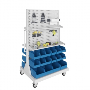 Комбинированная мобильная стойка с перфорированными панелями для инструментов и пластиковыми контейнерами для метизов, креплений и ЗИП. В комплектацию входят 4 перфорированные панели, позволяющие удобно разместить весь необходимый в работе инструмент при помощи специальных держателей: крючков, кронштейнов, специальных полок и лотков для инструмента, приспособлений для отверток, гаечных ключей, бумажных полотенец и другой оснастки. Распределенная нагрузка на перфорированную панель до 25 кг. Вместительные пластиковые контейнеры размещаются на 3 ярусах мобильной стойки. На нижнем ярусе размещены 8 контейнеров размером 150х225х350мм На 2 и 3 ярусах размещаются 24 контейнера размером 130х150х250мм - по 6 контейнеров на одной стороне каждого яруса. Контейнеры устанавливаются на держатели SPD 402 с допустимой нагрузкой до 30 кг. Всего в комплектации Mobiler SPK4 - 32 контейнера. Дополнительно мобильная стойка комплектуется двумя навесными полками SP401 с допустимой нагрузкой до 30 кг и двумя навесными полками SP402 с допустимой нагрузкой до 40 кг для размещения, хранения и перемещения инструментов и приспособлений. Общая допустимая нагрузка на мобильную стойку до 450кг.