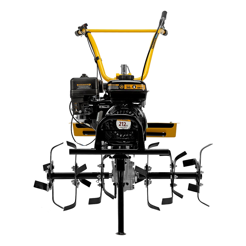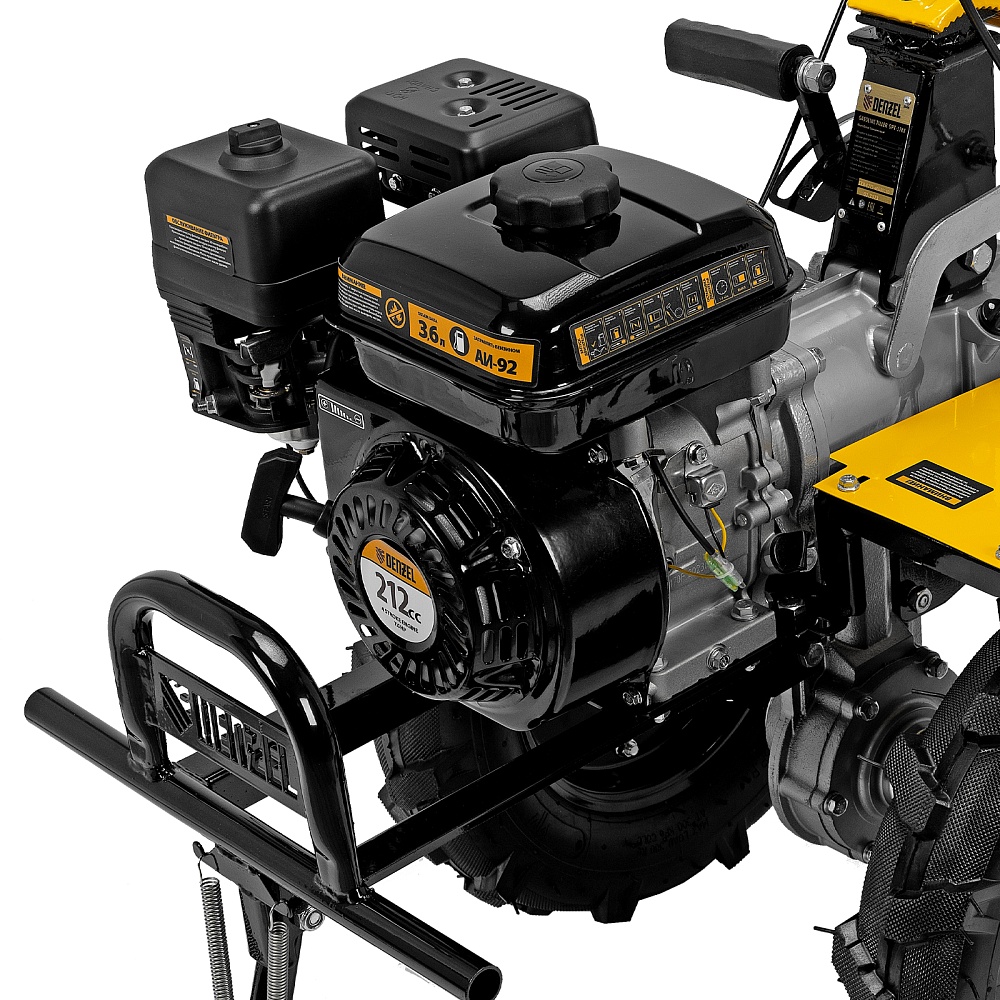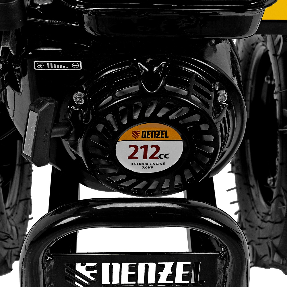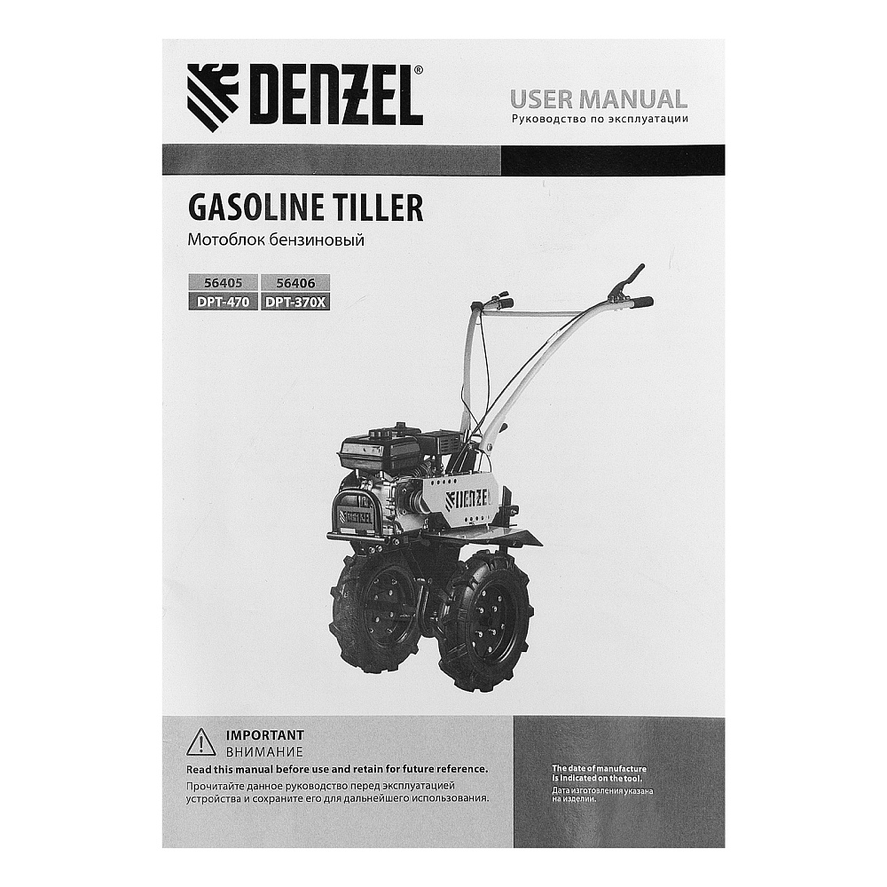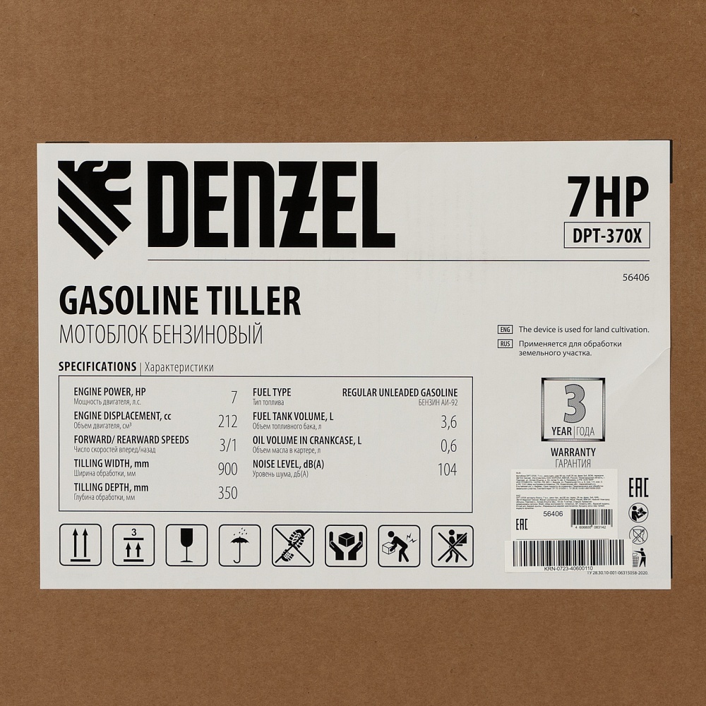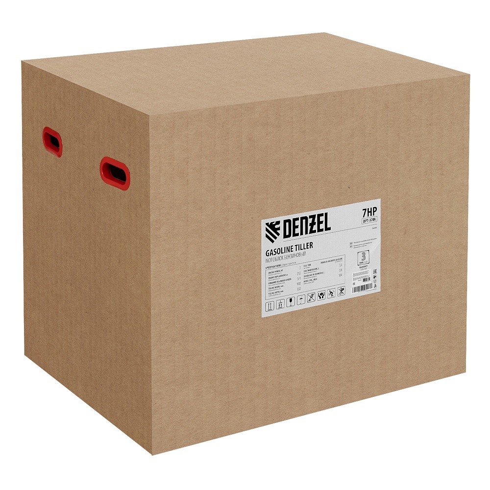 <p>Мотоблок Denzel 56406 DPT-370X мощностью 7 л.с., с дисковым сцеплением, фрезами 3 х 4, валом отбора мощности (ВОМ), передачами 3В/1Н, имеет ширину вспахивания 90 см и глубину обработки 35 см. Предназначен для обработки почвы: рыхления, боронования, выравнивания, прополки и выполнения других задач на приусадебных и садовых участках, уверенно справляется с плотной глинистой почвой.,Мощный и экономичный одноцилиндровый четырехтактный двигатель Denzel серии Long Life с рабочим объемом 212 см3 отличается надежностью и продолжительным ресурсом. Многодисковый механизм сцепления обеспечивает передачу высокого крутящего момента на колеса. Мотоблок предназначен для работы на большой территории и широко используется в быту.</p><h2>Преимущества</h2><ul><li>Высокопроизводительная коробка передач — 3 передачи вперед и одна назад позволяют подстраиваться под тип почвы и легко извлекать почвофрезы из любого грунта.</li><li>Удобная эксплуатация — рукоятки руля регулируются в 2 плоскостях — вертикально и относительно продольной оси машины.</li><li>Легкое управление — регулятор оборотов двигателя, выключатель зажигания и рычаг сцепления находятся на рукоятке перед пользователем.</li><li>Усиленный сошник толщиной 12 мм — можно менять глубину вспахивания, удерживать равновесие при обработке почвы и использовать его в качестве задней опоры при хранении мотоблока.</li><li>Многофункциональность и экономия бюджета — вал отбора мощности позволяет подключать к мотоблоку активное навесное оборудование.</li><li>Защита от работы при низком уровне масла LO-protection — мотоблок не включится при незаполненном картере, такое решение предотвращает поломку двигателя и продлевает срок службы техники.</li><li>Безопасная работа — широкие крылья защищают пользователя от вылетающих фрагментов почвы, камней и прочих предметов.</li><li>Низкий расход топлива 1 л/ч — можно непрерывно работать более 3-х часов, не отвлекаясь на заправку.</li><li>Долговечность — чугунный корпус редуктора и стальные фрезы (в комплекте поставки 24 шт.) отличаются особой прочностью.</li><li>Надежный карбюратор — мотоблок работает стабильно даже при высокой нагрузке на двигатель.</li><li>Качественные детали — закаленный до твердости 45-50 HRС стальной коленвал и надежный распредвал обеспечивают высокую производительность мотоблока в любое время года.</li><li>Воздушный фильтр — поступающий в цилиндр воздух очищается от твердых частиц, что обеспечивает его высокий ресурс — это особенно важно при обработке сухой почвы.</li><li>Эргономичность — рукоятки изогнутой формы находятся на оптимальном расстоянии друг от друга и усилены стальной перекладиной, поэтому пользователь не устанет даже при длительной работе.</li><li>Комфортная транспортировка — усиленная рукоятка-бампер и большие колеса с глубоким протектором позволяют с легкостью перемещать мотоблок до нужного места.</li><li>Складная ножка — дополнительная опора позволяет удобно располагать мотоблок в зоне хранения без риска опрокидывания.</li><li>Расширенная гарантия 3 года — качество мотоблока подтверждено производителем.</li></ul>