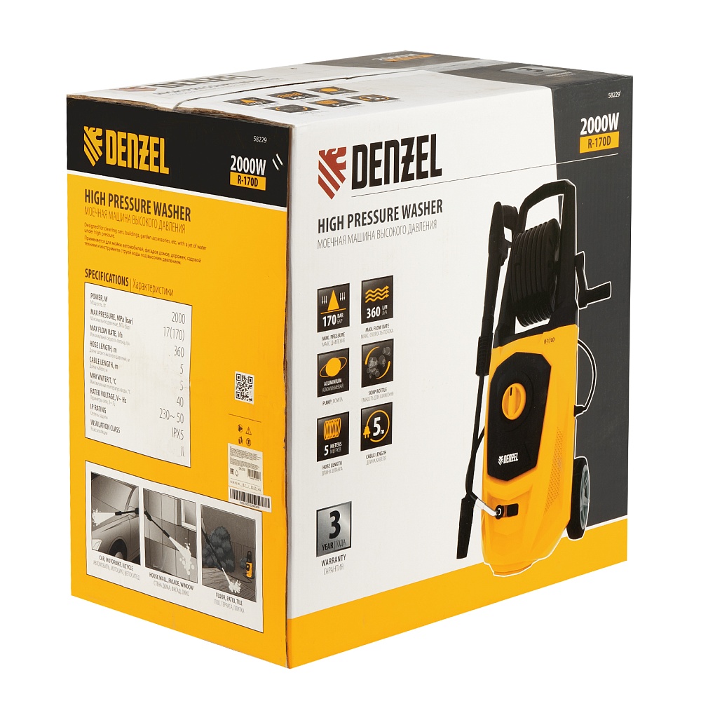 <p>Моечная машина высокого давления Denzel R-170D 58229 с барабаном, мощностью 2000 Вт и производительностью 360 л/ч, подает струю воды под давлением 170 бар и используется для очищения поверхностей. Позволяет быстро удалить загрязнения с кузова автомобиля, мотоцикла, велосипеда, садового и хозяйственного инвентаря, очистить садовую дорожку и террасу, а также стены и окна строений. Источником воды может служить водопроводная линия, а также любая емкость — машина способна работать в режиме самовсасывания. Мойка пригодится владельцам загородных участков.</p><h2>Преимущества</h2><ul><li>Надежность — двигатель с медной обмоткой обеспечивает стабильную работу моечной машины даже при высоких нагрузках.</li><li>Защита от перегрева — термозащита отключает двигатель в случае перегрузки, предохраняя его от поломки.</li><li>Высокий ресурс — алюминиевая помпа рассчитана на интенсивное использование.</li><li>Экологичность — машина работает без вредных выхлопов и неприятных запахов.</li><li>Система фильтрации — вода поступает без посторонних примесей, что увеличивает срок службы машины.</li><li>Класс защиты II — двойная изоляция токопроводящих элементов надежно защищает пользователя от поражения электрическим током.</li><li>Установка оптимального вида распыления — насадка-удлинитель оснащена регулируемым соплом.</li><li>Блокировка рычага пистолета — защита от случайного запуска обеспечивает безопасность пользователя.</li><li>Комфортная работа в труднодоступных местах — насадка-удлинитель позволяет очистить самые удаленные уголки.</li><li>Эффективная работа — можно использовать моющее средство, для которого предусмотрен встроенный бачок.</li><li>Простое подключение — быстросъемный адаптер позволяет легко присоединить входной шланг.</li><li>Длина шланга и кабеля 5 м — не нужно часто перемещать машину, можно работать на удалении от розетки.</li><li>Несложный уход — в комплект поставки входит игла для прочистки сопла.</li><li>Удобная эксплуатация — катушка позволяет вытягивать шланг на нужную длину.</li><li>Мобильность — мойка оснащена колесами и ручкой для удобного перемещения. </li><li>Гарантия 3 года — высокое качество машины подтверждена производителем.</li></ul>