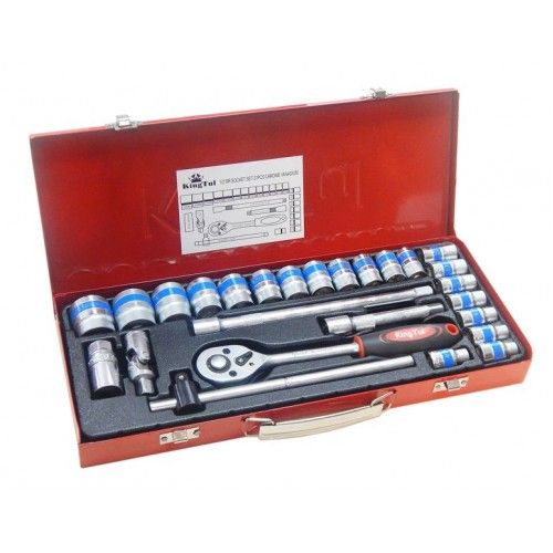 Набор инструмента 24пр. KINGTUL 1/2'' (8-32мм)(6-гран.) в метал. кейсе: 1. 18 торцевых головок 1/2'': 10, 11, 12, 13, 14, 15, 16, 17, 18, 19, 20, 21, 22, 23, 24, 27, 30, 32 мм 2. Трещотка реверсивная с быстрым сбросом 1/2'' 45 зубов 3. Удлинители 1/2'' 125 и 250 мм 4. Вороток Т-образный 1/2'' 5. Карданный шарнир 1/2'' 6. Головка свечная