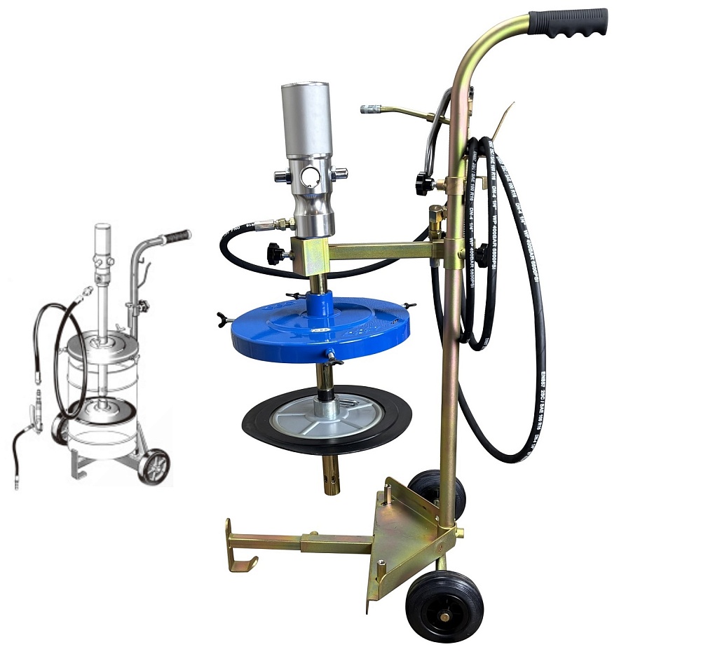 Нагнетатель смазки на ведро 18-20 кг. Пневмонасос 50:1 + тележка на 2 колесах с ручкой + армированный шланг длиной 4 м + крышка Ø 310 мм + мембрана + пистолет с наконечником для тавотниц оборудован "Z" образным шарниром для удобной и беспрепятственной работы в трудно доступных местах (вращение на 360град.). Подходит для ведер с внутренним Ø 260-300 мм. Давление смазки 350-400 Атм. Производительность 800 г/мин. Вес: 16 кг.