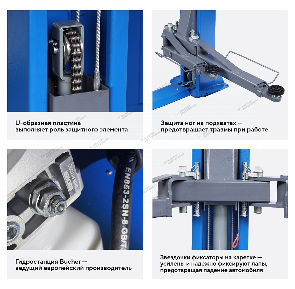 Надёжная система стопорения — механические фиксаторы на обеих колоннах предотвращают падение автомобиля при отказе гидросистемы;