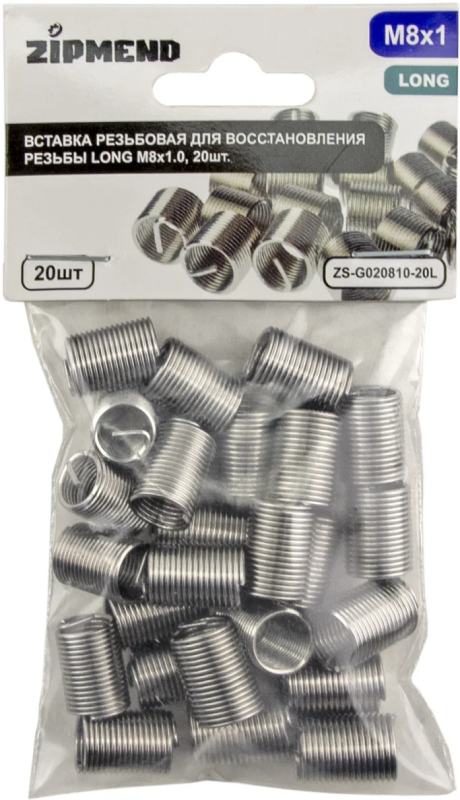 Вставка резьбовая для восстановления резьбы LONG M8 х 1.0, 20 штук, ZIPMEND, ZS-G020810-20L.