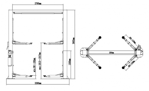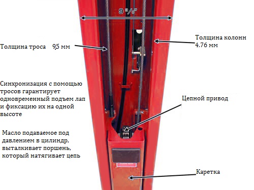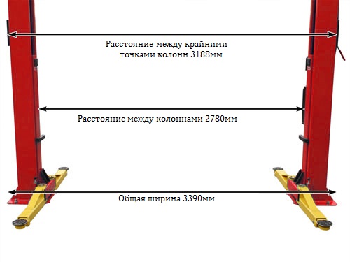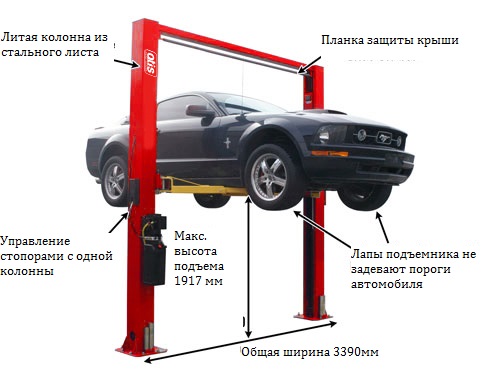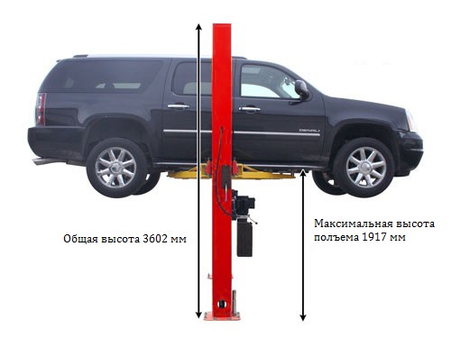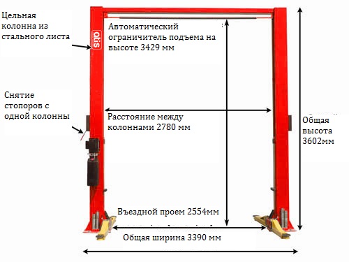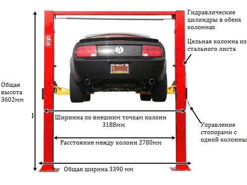 Двухстоечный электрогидравлический подъемник с верхней синхр. Грузоподъемность 4.0 т, высота колонны 3602мм, механическое управление стопорами на одной колонне.