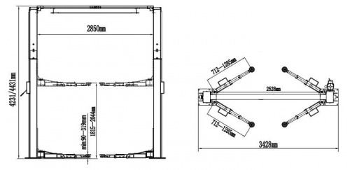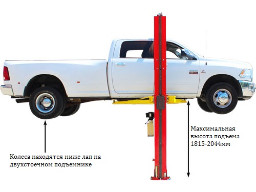Двухстоечный, высота подхвата, мм:185, Высота подъема, мм:1872-2101 Расстояние между стойками, мм: 3137 Передняя лапа, мм: 952-1834 Задняя лапа, мм: 952-1834 Управление стопорами с одной колонны Регулируемые подъемные проставки