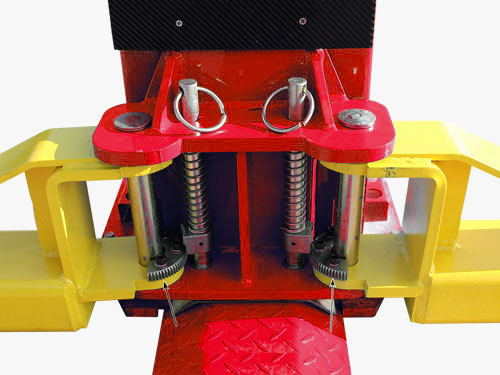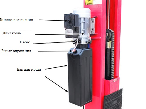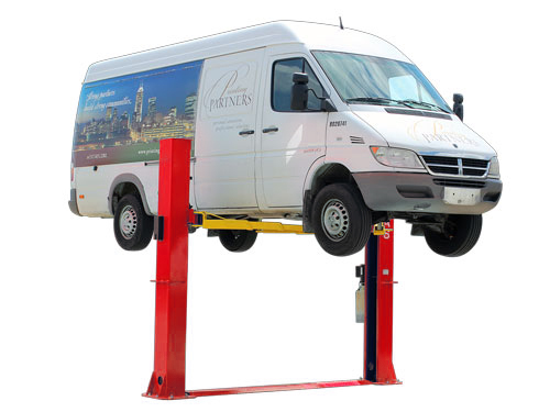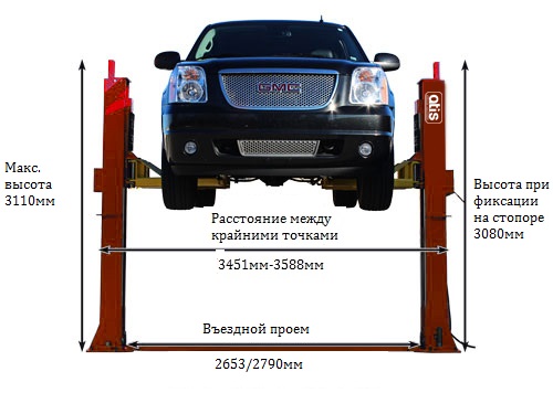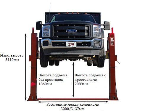 Двухстоечный электрогидравлический подъемник с нижней синхронизацией, грузоподъемность 5.5 т, механическое управление стопорами на одной колонне.