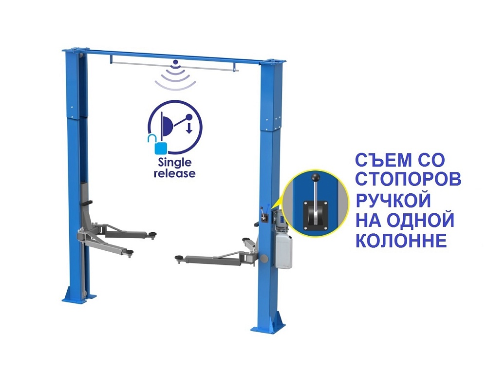 Электрогидравлический двухстоечный подъемник для легковых автомобилей, внедорожников и легкого коммерческого транспорта общей массой до 5т Классическая симметричная конструкция с удлиненными трехсоставными подхватами прекрасно подходит для работы с длиннобазными автомобилями Самая жесткая и устойчивая конструкция Нет порога между колоннами. Свободный заезд автомобиля по ровному полу. Нет ограничений при работе со вспомогательным мобильным оборудованием под автомобилем: тележки, трансмиссионные стойки и пр. Система синхронизации, расположенная сверху, не подвержена износу из-за контакта с влагой и грязью