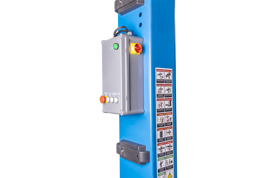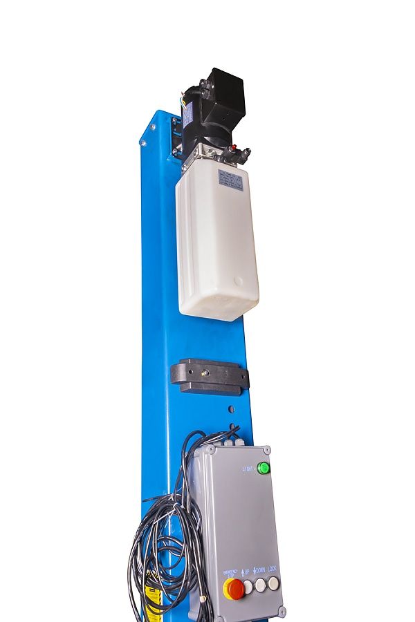 Двухстоечный электрогидравлический подъемник с верхней синхронизацией, грузоподъемность 4.5 т, высота колонны 4035/4313мм, механическое управление стопорами на одной колонне.