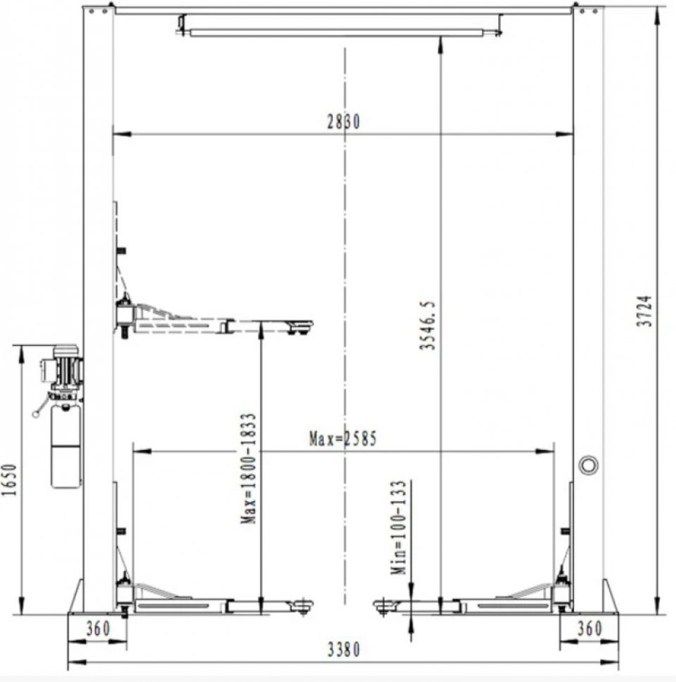 Подъемник оборудован механической системой безопасности. Замки безопасности надежно фиксируют каретку через каждые 90 мм подъема. При опускании автомобиля замки безопасности выводятся из фиксирующего положения. Гидросистема приводится в действие электрическим двигателем 380В 3,0 кВт, через гидронасос, создающий давление в системе до 200 кг/см2.