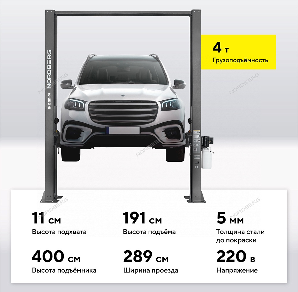 Подъемник двухстоечный 4 т, верхняя синхронизация, H=4 м, 220 В, серый NORDBERG N4120H1-4G_3+2_220 купить в Нижнем Новгороде цена ✅ - Все для СТО