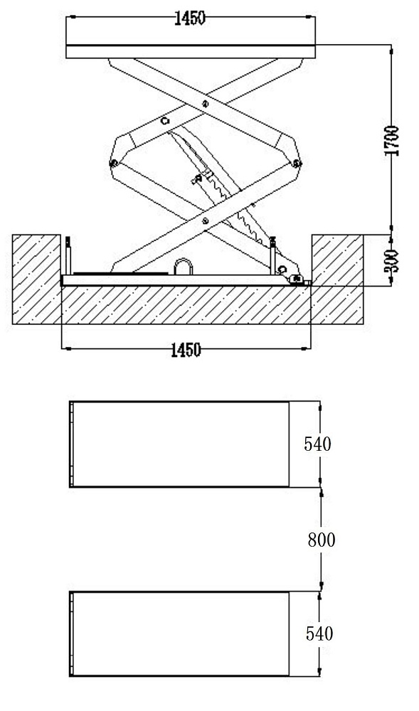 WDK-504 заглубляемый ножничный подъемник монтируется на приямок и в сложенном состоянии не выступает над уровнем пола. Удобен для установки в узких помещениях и зонах приемки автомобилей, где подъемник используется только при необходимости. Электрогидравлический насос установлен в станции управления на безопасном расстоянии от рабочей зоны. Клапан синхронизации и пневматическая разблокировка стопоров обеспечивают безопасную эксплуатацию подъемника.
