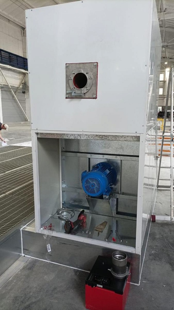 Покрасочно-сушильная камера 6,9 х 3,9 х 2,7 м., 5,5 и 5,5 кВт, 20 000 м3/ч, дизельная двухступенчатая горелка, освещение верхнее наклонное 8х4х18=576 Вт, тепловая мощность 202 кВт, 3-х створчатые ворота, сервисная дверь, металлическое основание