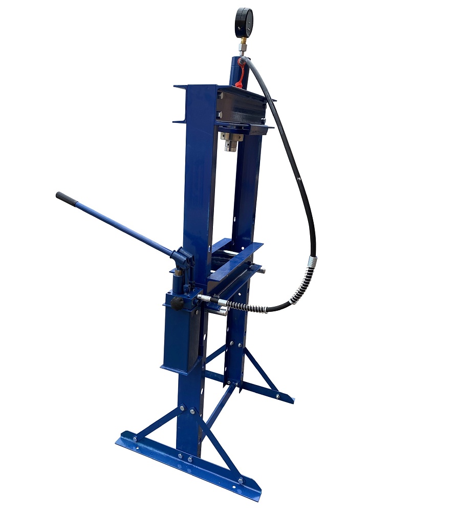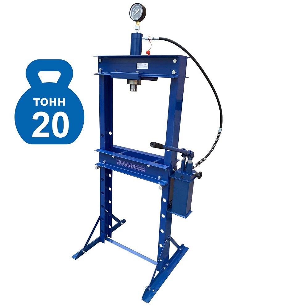 Пресс гидравлический ручной для автосервиса. Усилие 20 тонн. Насос — 2 плунжера. Ход поршня 0-150 мм. Рабочее окно 500х1030 мм. Доставка по РФ и ТС. Поршень приводится в действие нажатием на ручку. Рекомендуется для выпрессовки деталей машин, втулок и т.п. в автосервисе, Гараже и СТО. Цвет синий. Гидроцилиндр с пуансоном имеет возможность перемещения по всей ширине станины.