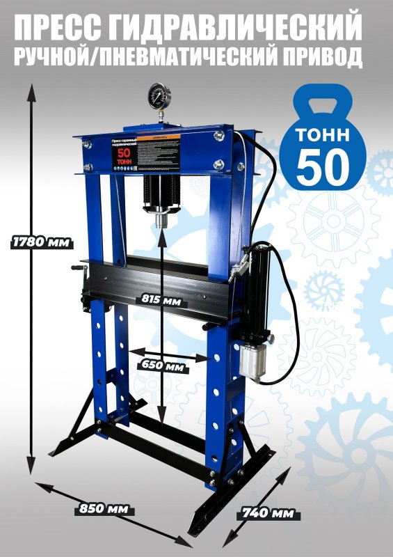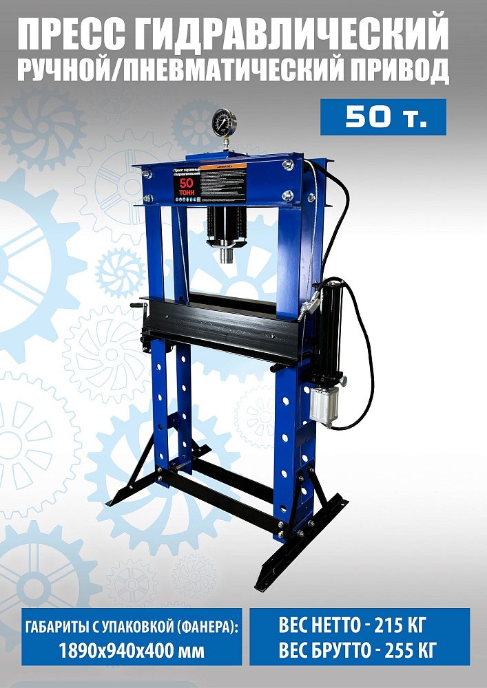 Пресс гидравлический оснащен насосом с ручными и пневматическим приводом с максимальным усилием 50т.