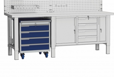 Имеет все четыре поворотные колесные опоры для более удобного маневрирования в небольших свободных пространствах. Возможна установка сверху модуля столешницы, аналогичной столешнице верстака, либо лотка. Размеры 620х650х770мм Для верстаков, предусматривающих установку модуля L-типа имеется возможность размещения мобильного модуля под столешницей. Так же модуль может применяться в качестве инструментальной тележки или мобильного рабочего места.
