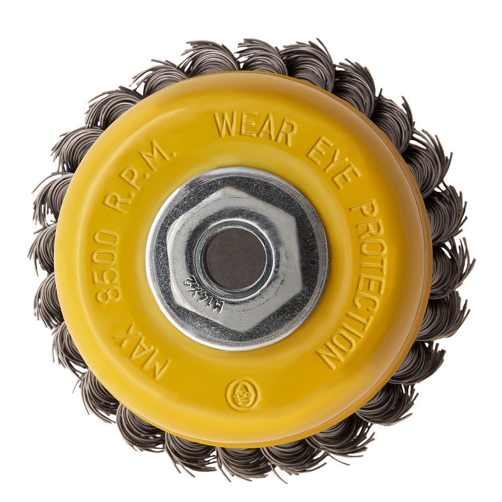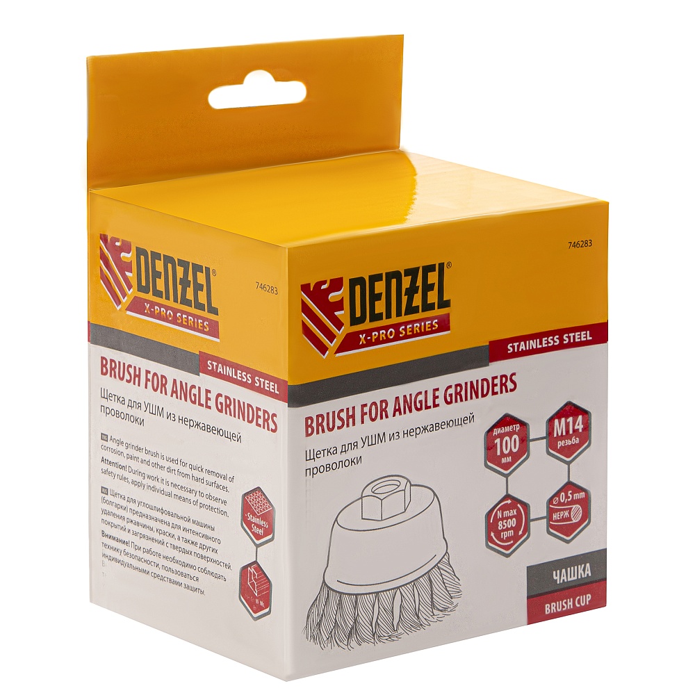 <p>Щетка для УШМ «Чашка» Denzel 746283, М14, диаметром 100 мм, с щетиной из крученой нержавеющей проволоки диаметром 0,5 мм, предназначена для грубой очистки твердых поверхностей от ржавчины, лакокрасочных покрытий, загрязнений, удаления заусенцев, а также для зачистки сварных швов. Снимает толстый слой материала, идеально подходит для обработки изделий из нержавеющей стали. Щетка имеет форму чашки и позволяет очищать участки большой площади. Оснастку устанавливают на вал углошлифовальной машины. Рекомендуемая максимальная скорость вращения составляет 8500 об/мин. Во время работы следует использовать средства индивидуальной защиты — очки, респиратор, наушники, перчатки, а также специальную одежду и обувь. Щетка применяется в строительстве, на производстве, а также в быту.</p><h2>Преимущества</h2><ul><li>Проволока толщиной 0,5 мм, скрученная в пучки, придает щетине устойчивость к повышенным нагрузкам.</li><li>Покрытый эмалью корпус и щетина из нержавеющей стали AISI 201 не ржавеют, поэтому щетку можно использовать в условиях сильной влажности.</li><li>Частицы проволоки из нержавейки, остающиеся на обрабатываемой поверхности, не вызывают ее коррозии.</li><li>Усиленный корпус и гайка обеспечивают повышенную прочность щетки.</li><li>Крепление на гайку М14 ускоряет установку и замену оснастки.</li><li>Строгий контроль качества на всех этапах производства подтверждает надежность щетки.</li></ul>