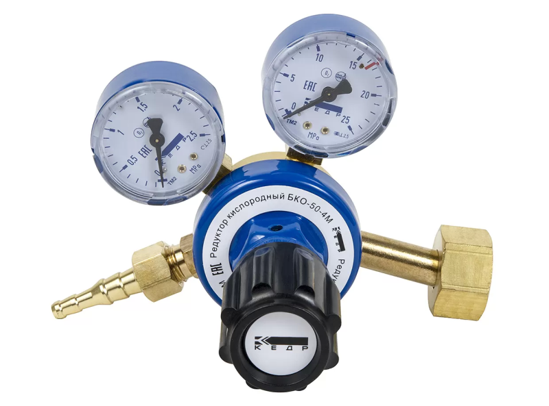 Редуктор кислородный КЕДР БКО-50-4М предназначен для понижения давления газа, поступающего из баллона, и автоматического поддержания заданного рабочего давления постоянным при газопламенной обработке.