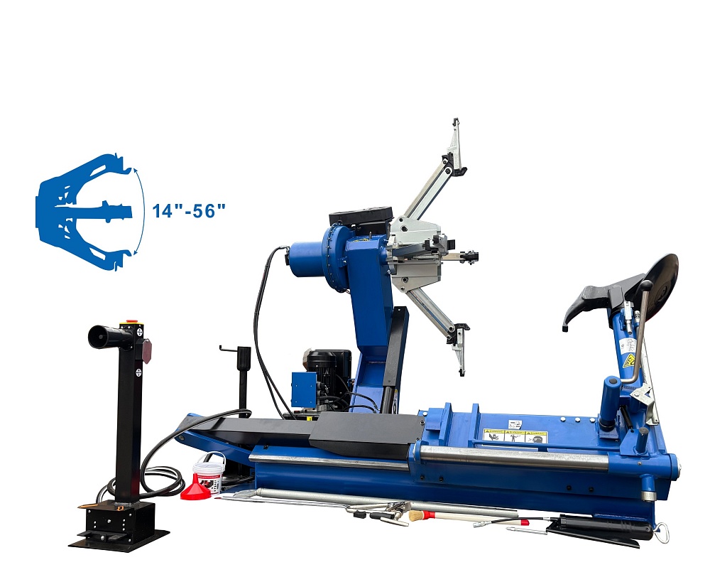 Универсальный электрогидравлический шиномонтажный стенд для монтажа и демонтажа шин грузовых автомобилей, автобусов, тракторов и спецтехники • Отжимной ролик и снимающий рычаг с системой быстрого поворота • Независимое перемещение зажимного устройства и каретки с монтажным инструментом • Переносной пульт управления • Универсальный 4-х кулачковый зажим с двумя скоростями вращения • Диаметр обслуживаемых дисков от 14’’ до 56”. Удлинители в комплекте
