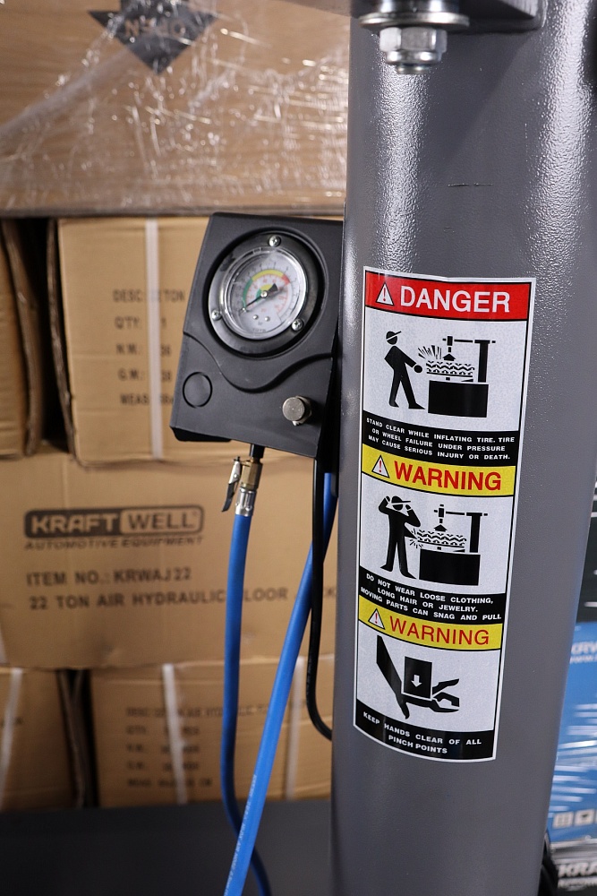 Вместо традиционного пистолета для подкачки шин используется шланг с управлением накачкой при помощи педали. Давление воздуха контролируется по манометру, установленному на колонне