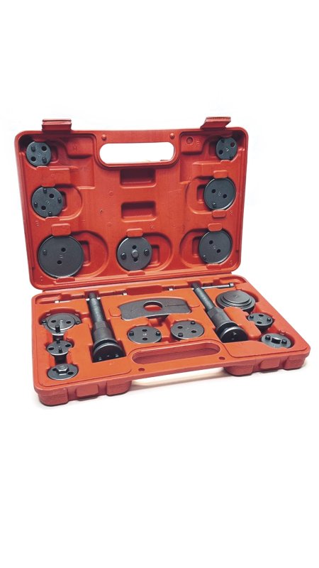 Предназначен для утапливания поршней тормозных цилиндров автомобилей с дисковой системой тормозов. Подходит для большинства автомобилей различных марок в том числе: Mercedes, BMW, Volkswagen, Opel, Audi, Ford, Honda, Subaru, Mazda, Nissan, Mitsubishi, Toyota, LandRover, Subaru и др. Расширенный перечень марок автомобилей, для которых применим набор: Opel, Citroen XM Xantia (F/R) Audi Fiat Alfa Romeo Ford Fiesta Jaguar XJ6/XJ40 BMW 318is/320i/325TD/518i/525i/1x/740i/850ci/M5 Mercedes Benz 190/200/300/420/560 Mitsubishi Colt Nissan Mera/Stanza/Sunny Range Rover Toyota Camry Volvo VW Passat/Golf GTI Ford NZ/Telstar/Laser Mazda Saab 9000 Alfa Romeo 1642 Honda Prelude/CRV 16i/Grand Prix/Lumina Nissan Primera, VW Golf IV, Audi 80/90/V8 + 100/Coupe Rover 800 ABS Subaru L+Z Ford Sierra ABS/Granada/Scorpio Honda Prelude Nissan Silvia 1.8 Turbo/Bluebird Nissan Primera 2.0i/LS/GS/GSX Peugeot 405 1.9Gi/Gri/Sri/Gtxi/MI16/605 2.0Sri Toyota Celica/Corolla GT/MR 2 Rover 8000 Saab 9000 VW Golf + Passat Cl/Gl/GT/GT 16V/Corrado 16V/Scirocco GTX 16V/Jetta Synchro/Jetta GTI 16V. Комплектация Комплектация набора: - 2 привода с правосторонней и левосторонней резьбой для различных марок автомобилей. - 2 упорные пластины. - Насадки – 15 шт. - Насадка для утапливания поршней без вращения – 1 шт. - Насадка-адаптер под вороток 3/8 – 1 шт.