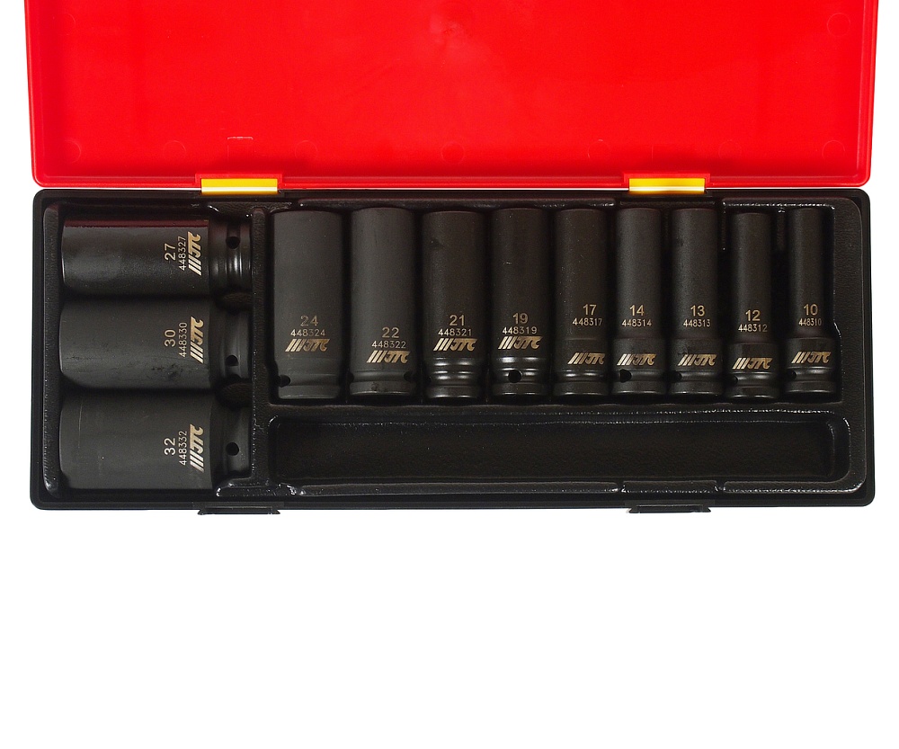 Артикулы JTC-448210-32: 12-гранные ударные головки глубокие: 10, 12, 13, 14, 17, 19, 20, 21, 22, 24, 27, 30, 32 мм. - 12 шт.