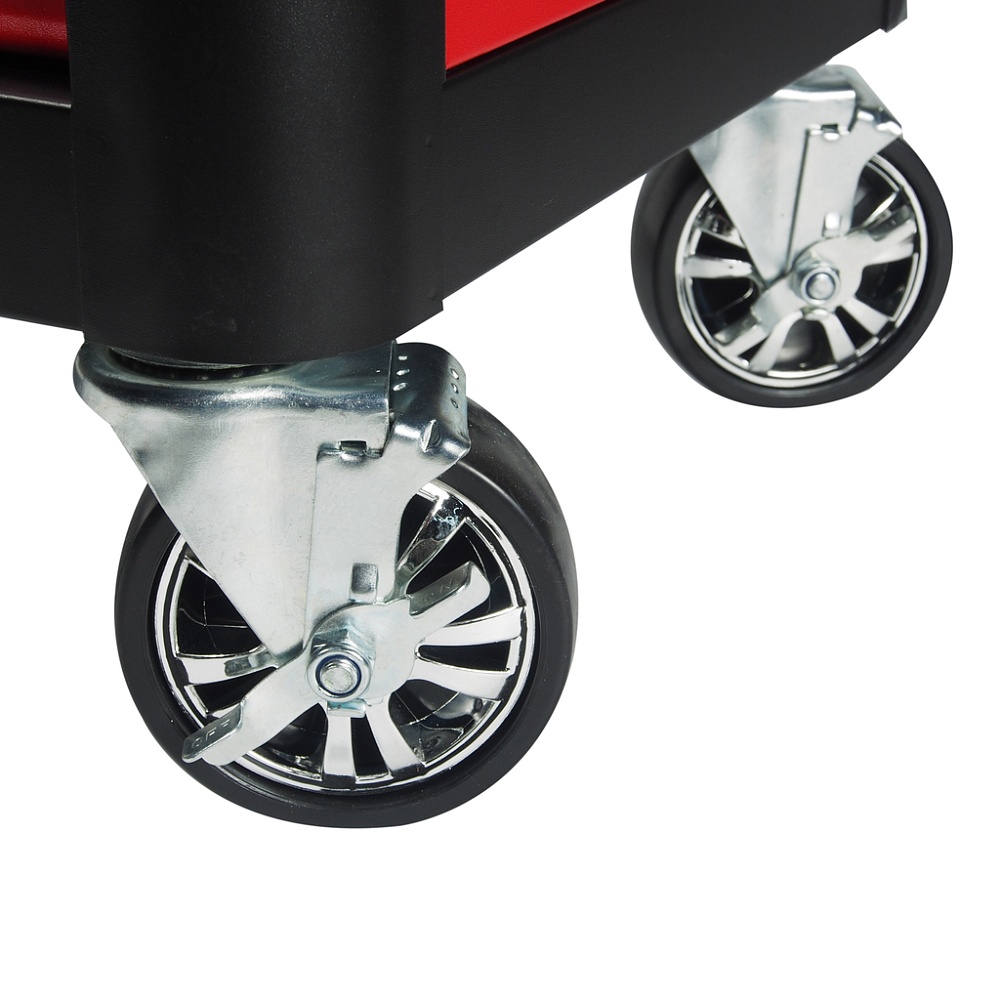 Тележка инструментальная (7 секций, красная, на колесах) JTC S1068 обладает значительным объемом. Наличие нескольких ящиков позволяет систематизировать хранение инструмента. Поворотные колеса существенно облегчают перемещение тележки даже при полной загрузке. В верхней части имеется удобная рукоятка. Боковой карман функционален: можно хранить небольшой инструмент или мелочь в процессе работ. Верхняя полка покрыта защитным материалом.