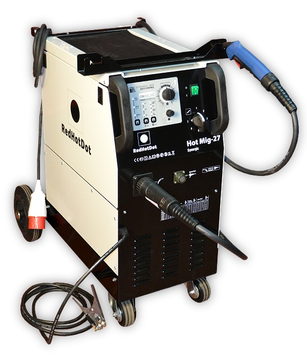 Сварочный полуавтомат RedHotDot HOT MIG-27 010277 - трехфазный аппарат, который используется для сварки обычной и нержавеющей стали, алюминия, сварки-пайки высокопрочных сталей проволокой CuSi и CuAl, прихватывания с регулируемым диаметром точки и пр.
