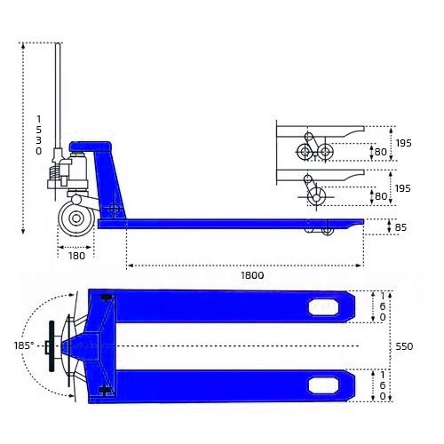 Особенность модели удлиненные вилы – длина 1800 мм вместо стандартных 1150 мм. Подходит для достаточно интенсивной работы и перемещения грузов весом не более 2500 килограмм.