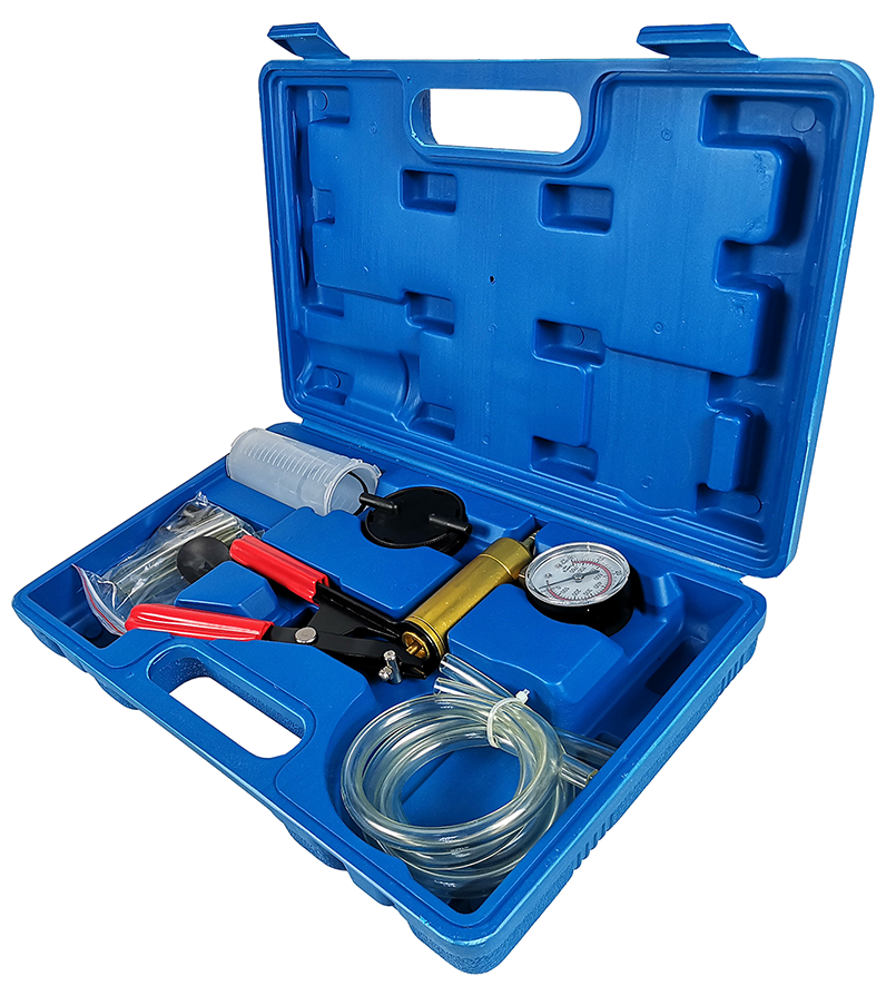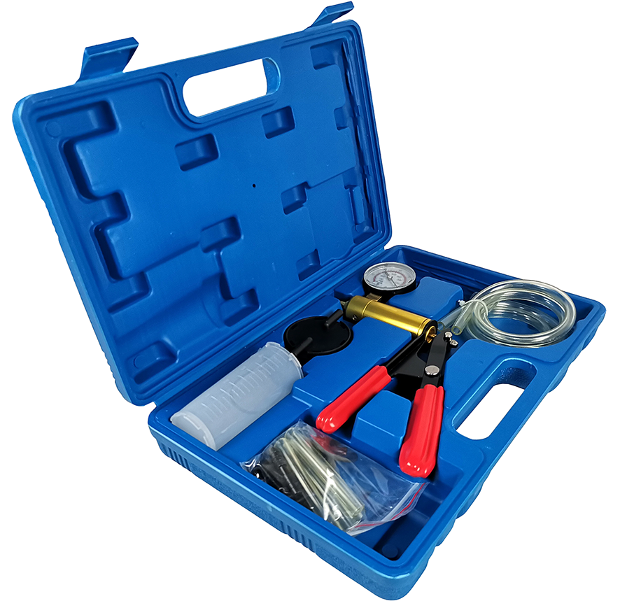 Вакуумный насос, 2шт шланга длиной 80см, 8шт адаптеров, пластиковый стакан для тормозной жидкости.