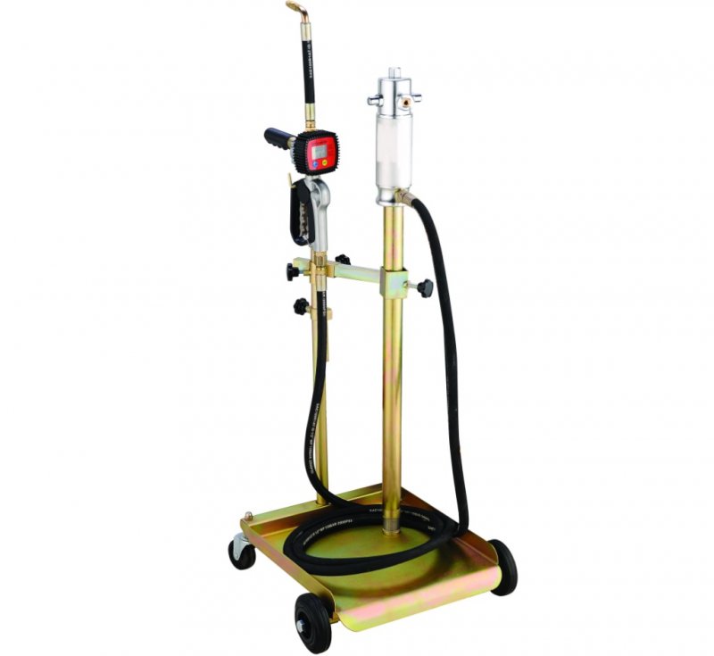 Тележка под бочки 20-60 кг. Установка оснащена тележкой, пневматический насос для масла 5:1 производительность 14л/мин, шланг 4 м, раздаточный пистолет с электронным счетчиком. Колёса 2 прямых + 2 поворотных. Масса: 25,5 кг.