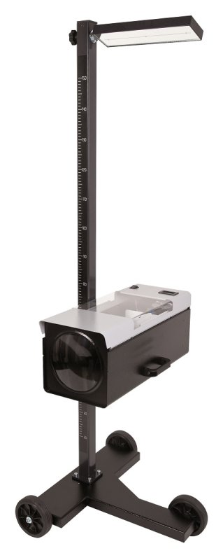 Контроль высоты подъема оптического блока производится при помощи метрической шкалы, нанесенной в виде наклейки на стойку.