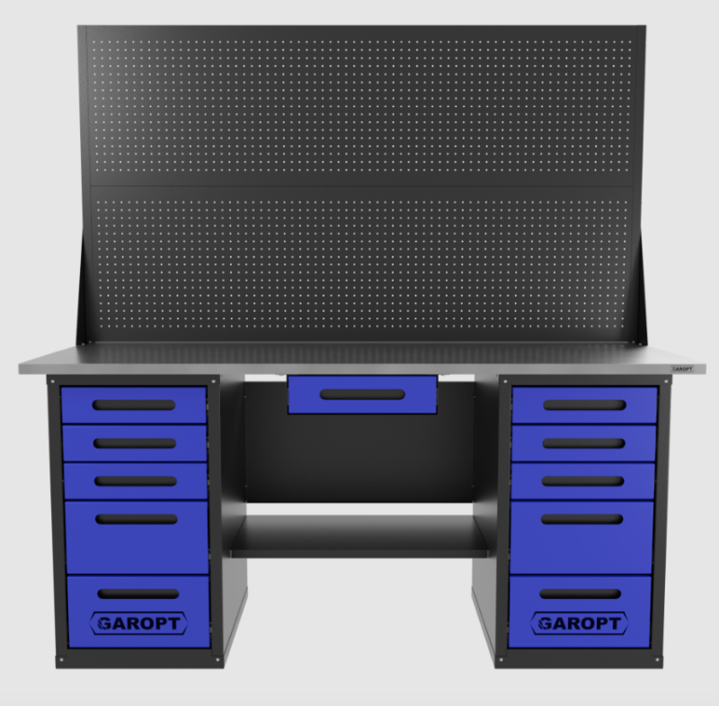 Верстак серии Low Cost в синем цвете — функциональное и прочное рабочее место для мастерской, автосервиса или домашнего гаража. Оснащён тумбой с пятью выдвижными ящиками и перфорированным экраном для комфортной организации инструмента.