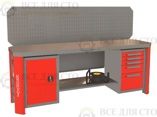 Рабочее место Верстакофф MECHANIC №151 114103 применяется в автомастерских, гаражах, производственных цехах. В комплект поставки входит козырек с лампой освещения, что дает возможность выполнять операции в помещениях с дефицитом света. Большая длина (1500 мм) и стальное покрытие столешницы обеспечивают устойчивость к высоким нагрузкам. Крупные инструменты легко размещаются в полке-стенке или в модуле с дверцей.