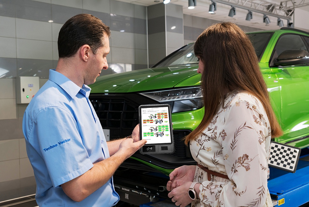 Планшет с предустановленным ПО TechnoVector Assistant позволяет удаленно управлять ПО Вектор, делать фото и прикреплять их к заказу. Отдельный экран для режима регулировки позволяет проводить процедуру без необходимости постоянно сверяться с показаниями на экране монитора.